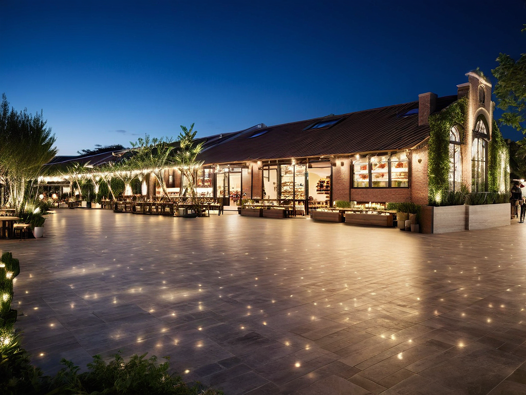 Promptfood hall, garden, same construction materials, same facade style, amazing terrace