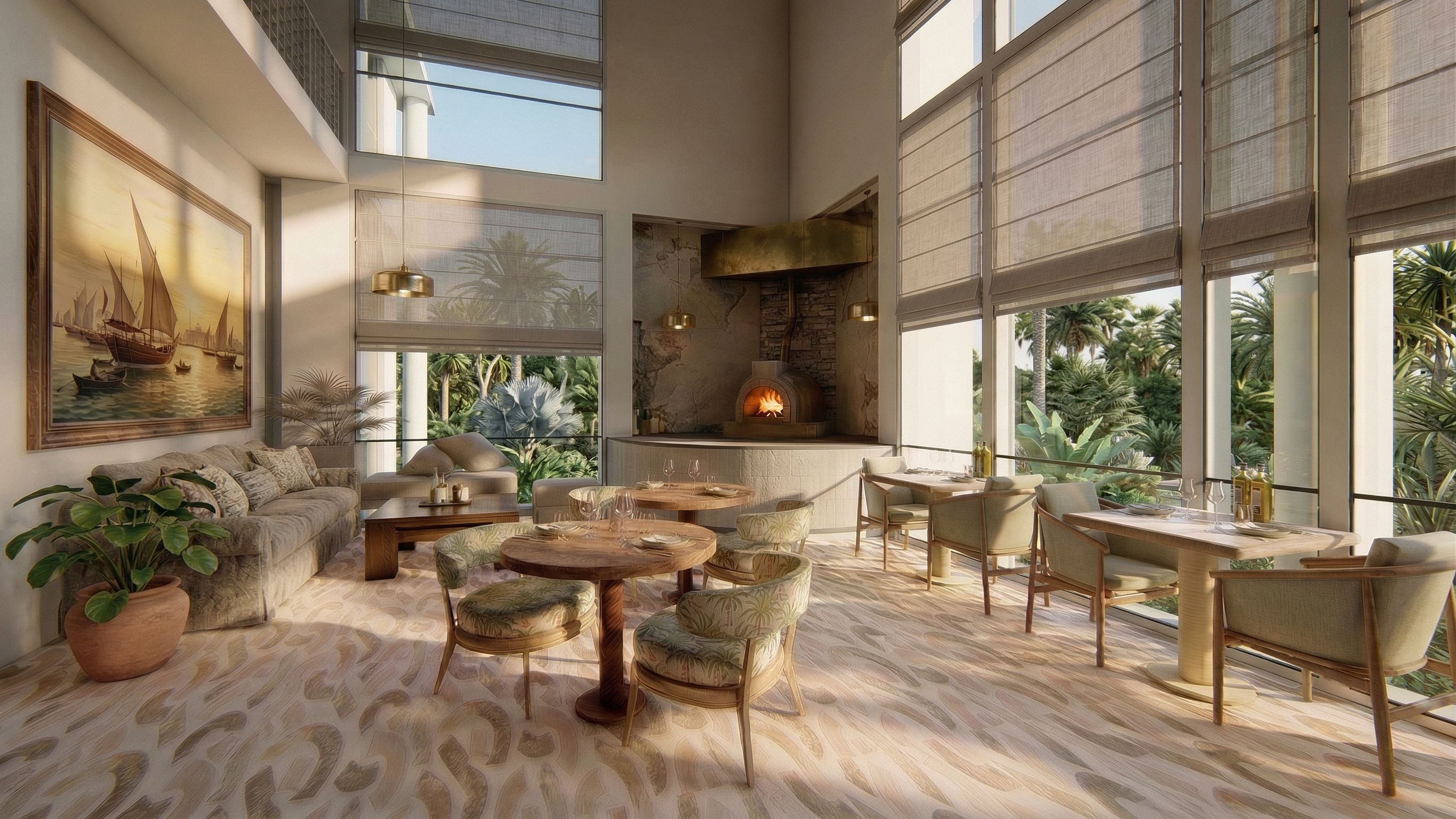 Promptdon't show buildings outside. just trees and palm trees, keep exact camera angle