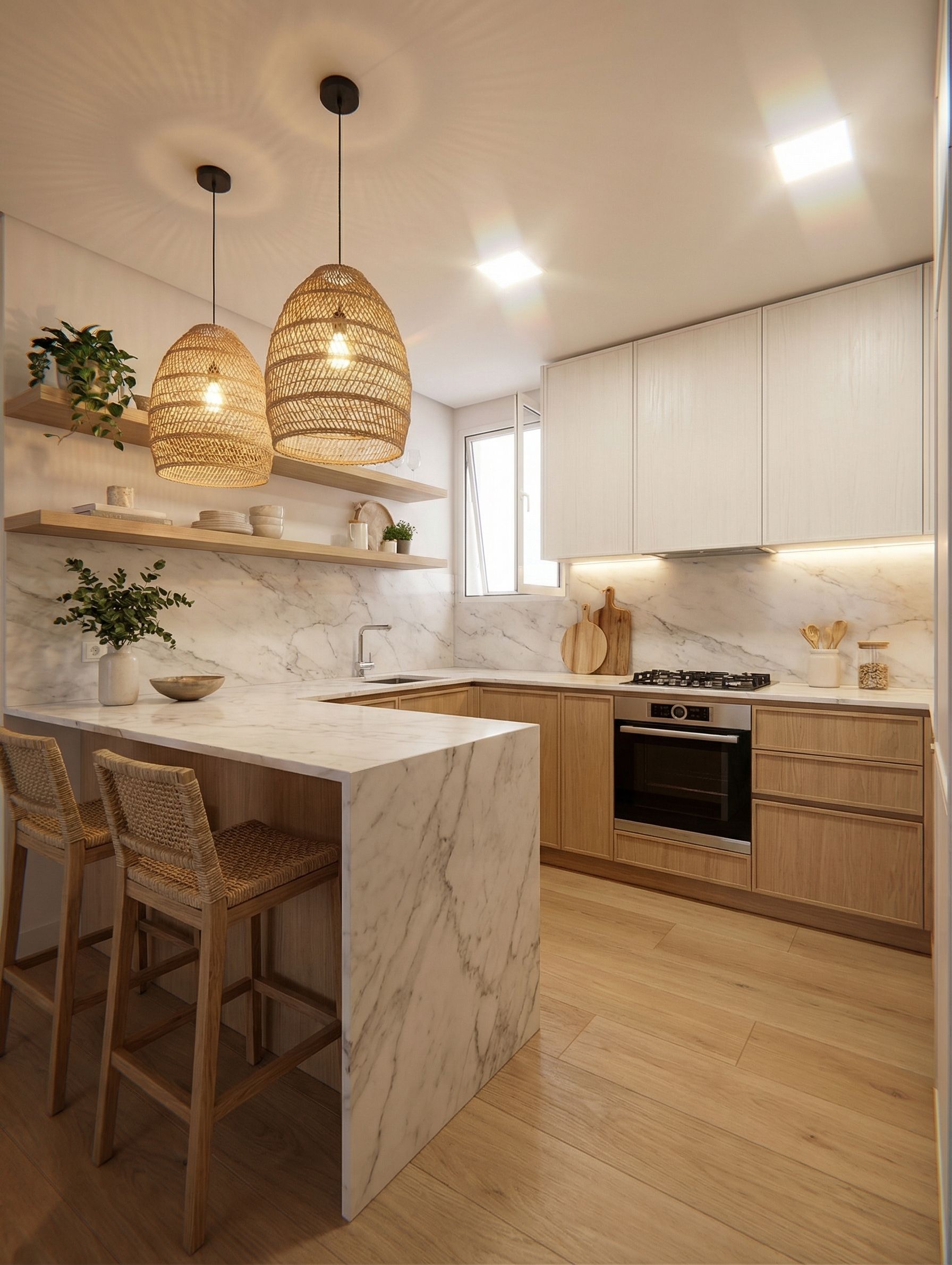 Prompt Retirar todos os moveis da cozinha e objectos da cozinha, colocar chao em madeira e mantendo o layout da imagem remodelar a cozinha como na referencia, janelas todas abertas e luzes acesas, keep exact camera angle
