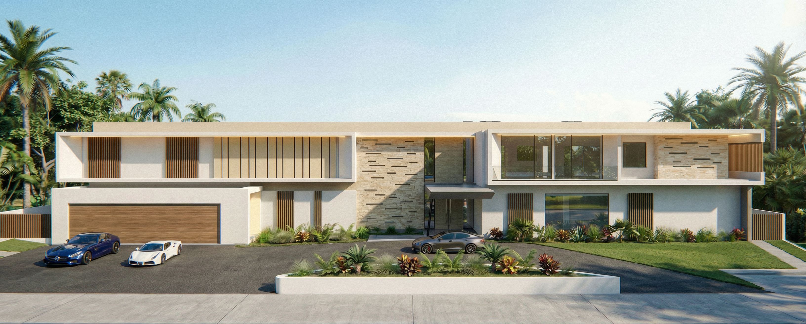 PromptCOLOCAR UN MERCEDES BENZ DEPORTIVO COLOR AZUL OSCURO A LA IZAUIERDA DEL FERRARI. NO HACER NINGUN OTRO CAMBIO, keep exact camera angle