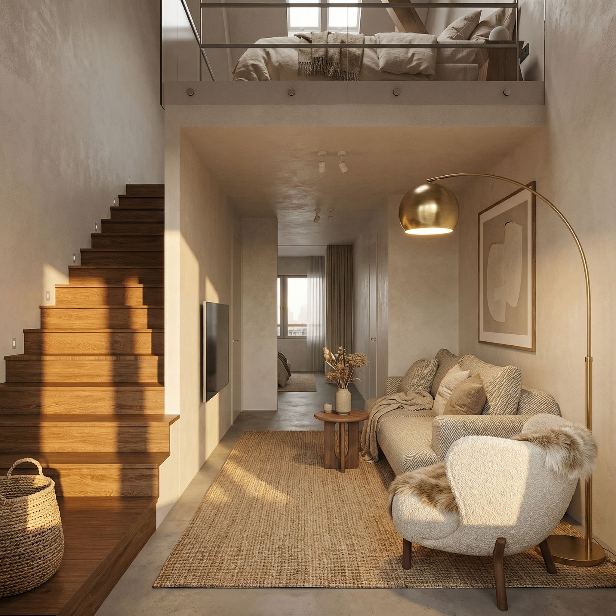interior design rendering, render this 3D mass into photorealistic rendering, Keep the exact same composition, camera angle, framing, proportions, and perspective. Do not crop or zoom. make this render more realistic , add the decor element , a calm and photorealistc image in scandinavin style , with warm atmophere , better texture , keep exact camera angle, golden hour warm lighting, high quality, professional, detailed scene