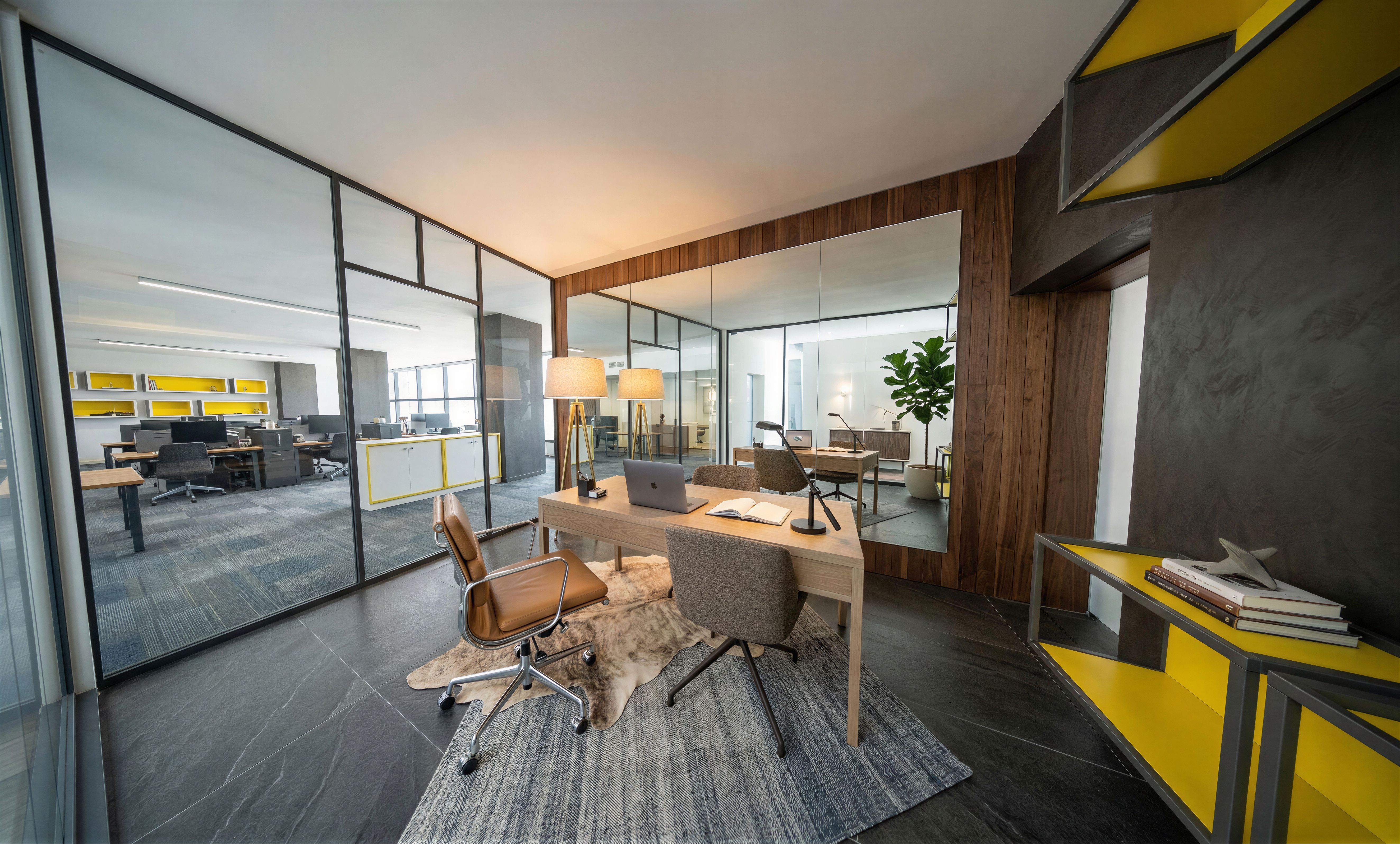 EnhancedPromptPhoto of a modern office interior featuring a sleek desk and two ergonomic chairs. Emphasize the combination of warm wood paneling and contemporary glass walls, with reflections capturing the workspace behind. Include a soft texture from the area rug and ambient light from a stylish lamp. The scene is set in a bright, inviting atmosphere during the day, casting gentle shadows. Perspective from a corner angle to showcase the open layout and vibrant shelving accents, with a shallow depth of field to focus on the desk area. white walls, big mirrored panel behind office desk, keep exact camera angle