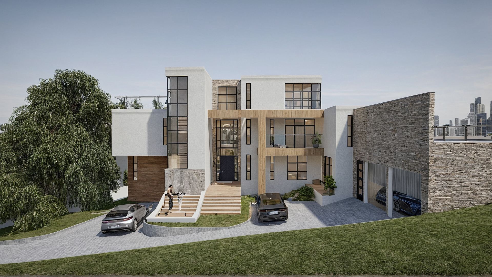 PromptCreate a photorealistic daytime render of a modern multi-story townhouse on a sloped lot. The design features clean lines, white stucco, light wood siding, light beige stone cladding, and black-framed floor-to-ceiling windows. Include a glass stair tower, floating balconies with glass railings and greenery, potted plants on balconies, and a water fountain with sculptures in front of the stairwell. Show a split-level driveway with luxury cars, a textured garage facade, and lush landscaping.