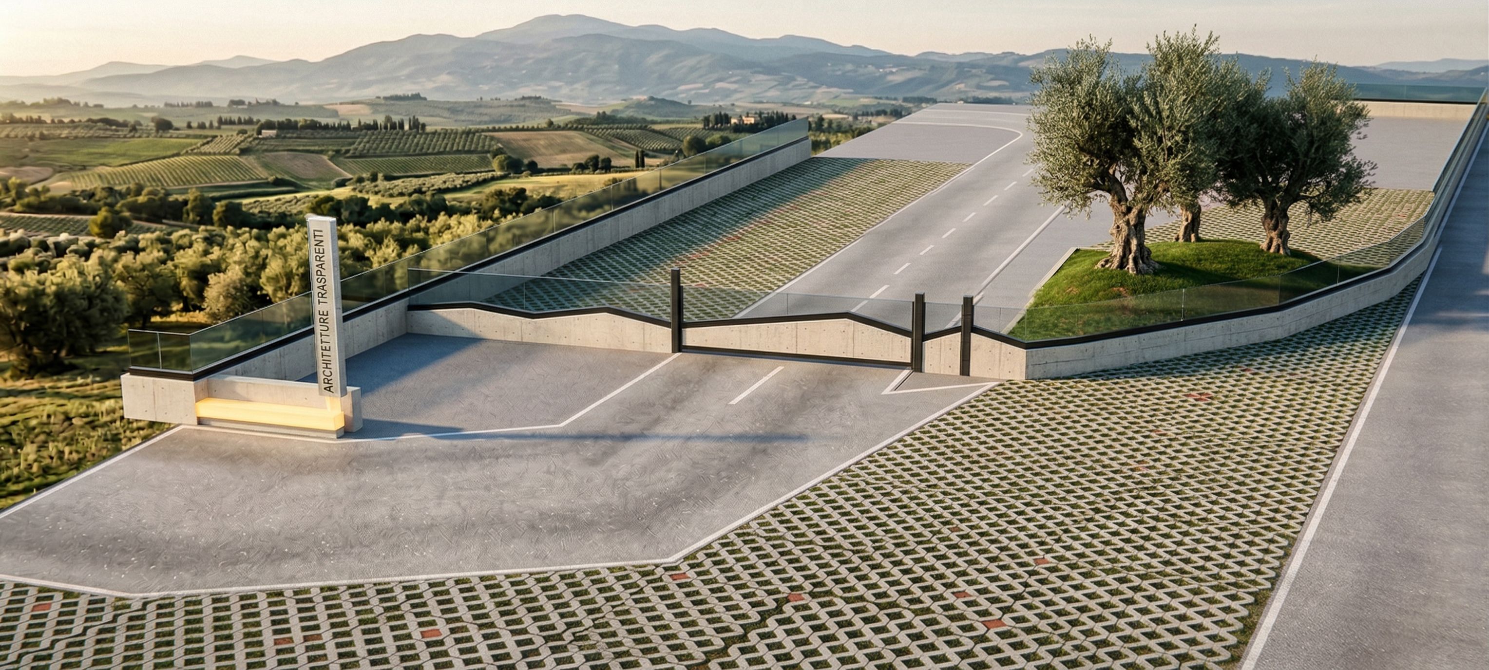 Create a highly realistic image of this "base" image. Insert the following materials, matching the colors in the uploaded image: Red is light-colored exposed concrete; "everything purple" is dark asphalt road; "only what's turquoise-blue" is light-colored asphalt; yellow is light-colored plastic, illuminated; the hill-shaped green is a green lawn with three centuries-old olive trees; blue is a draining "green park" pavement, like "Reference Image 1"; the white background is a farmland. Above the walls indicated in red is a semi-transparent glass balustrade with a dark aluminum profile underneath corresponding to the light green in "Reference Image 1". , keep exact camera angle