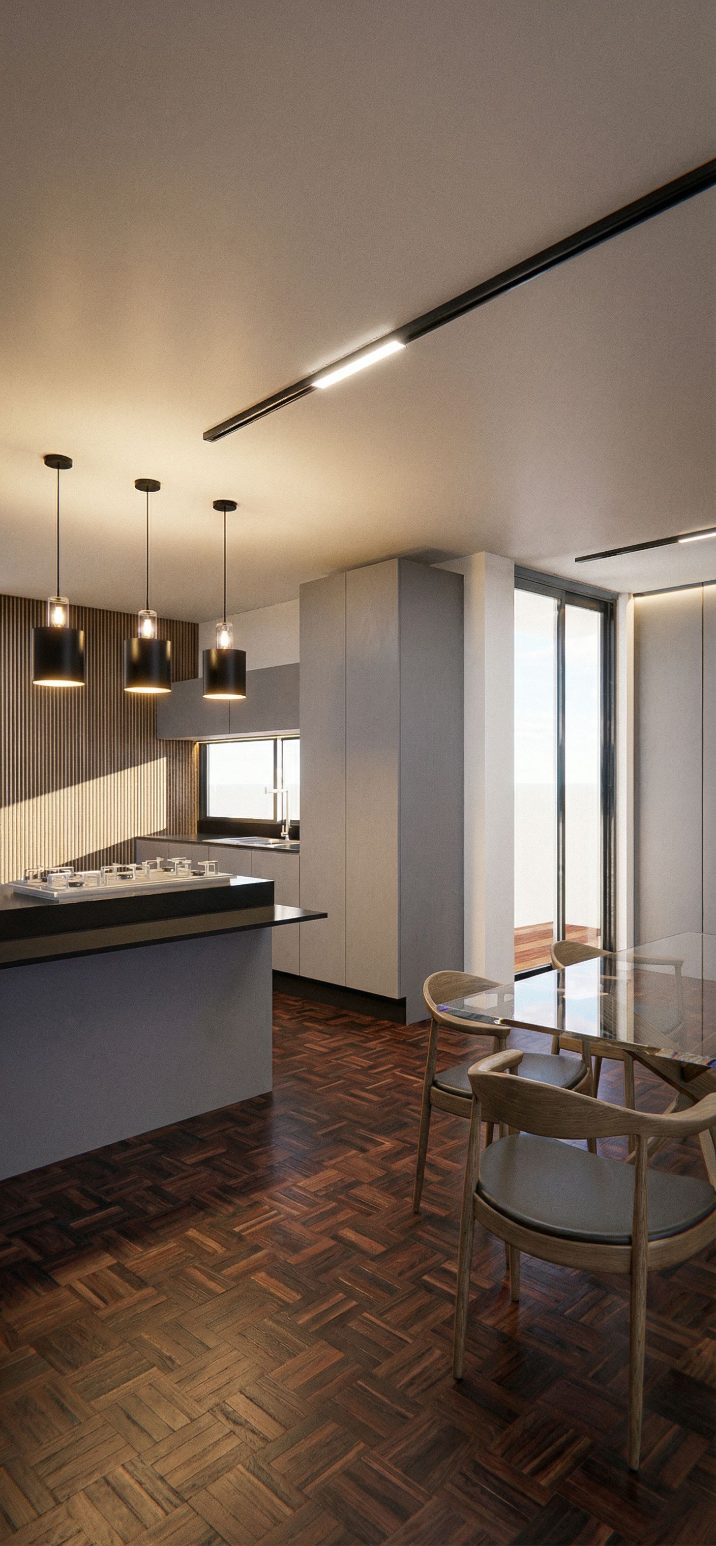 porfa ayudame a cambiar el piso de este render por el que te adjunto como referencia y a añadir 3 lamparas como la que te puse en referencia arriba de la barra de la cocina de resto no cambies nada , keep exact camera angle