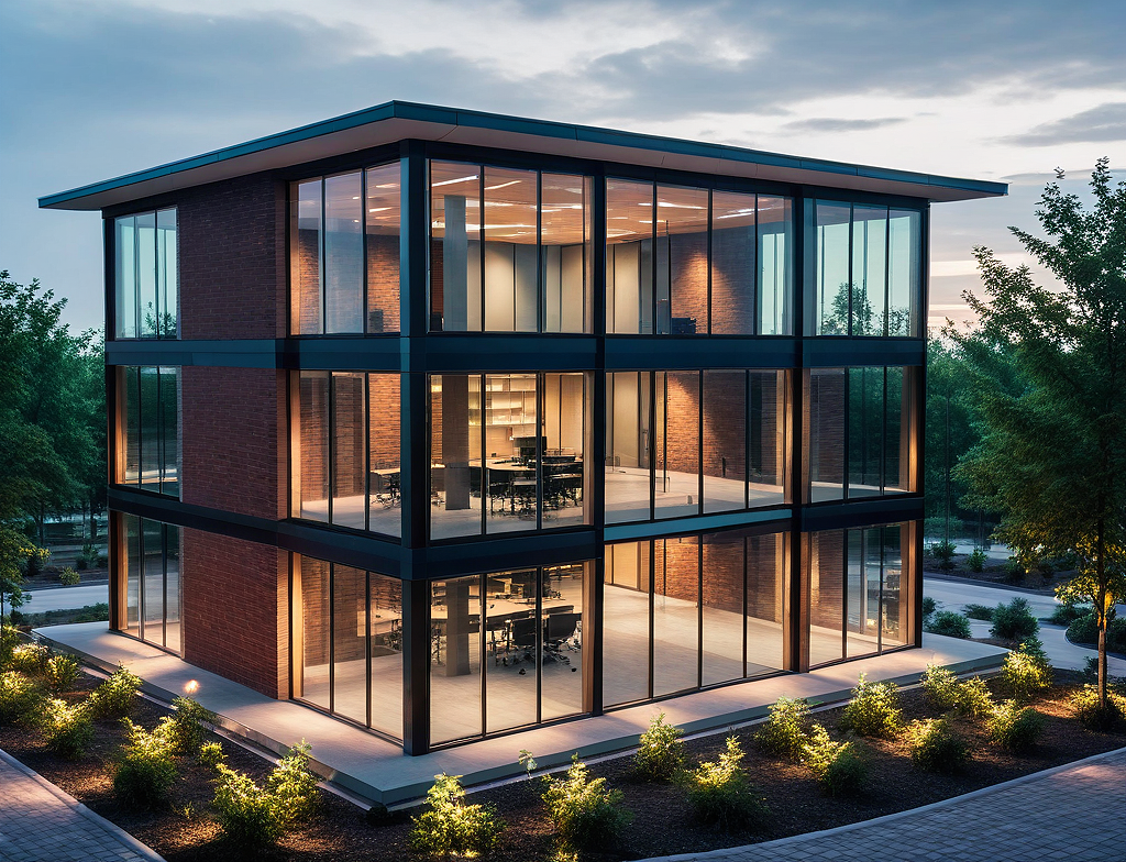 modern office building, glass, elegant, bricks, lights, nature