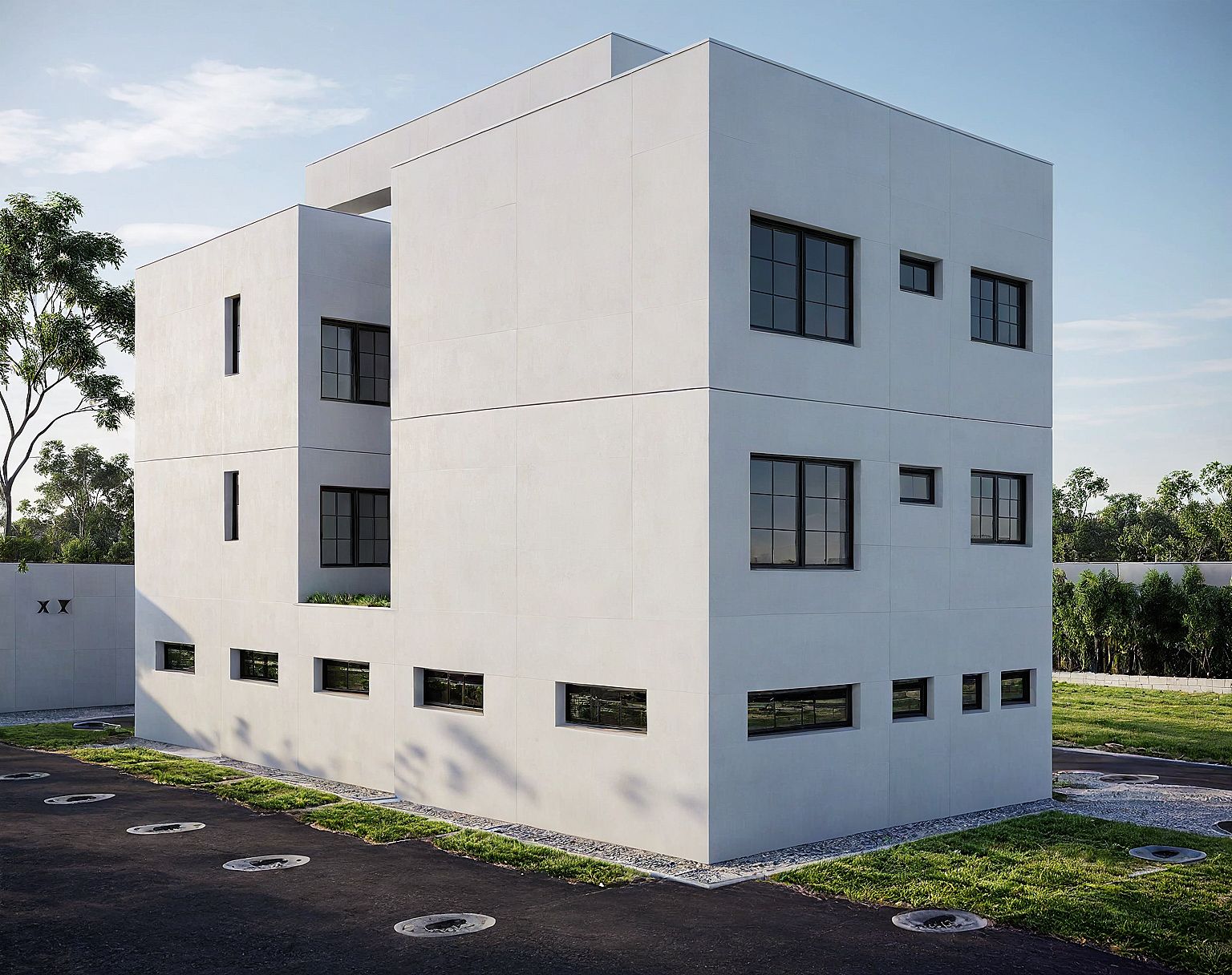 Enhance this 3D building design to a realistic, high-quality render. Apply clean grey walls, realistic glass reflections on windows, sharp black window frames and doors, and natural daylight lighting. Add subtle landscaping with green grass and a clean paved road. Keep the modern minimalist style intact. Emphasize realism, sharpness, and professional finish for client presentation
