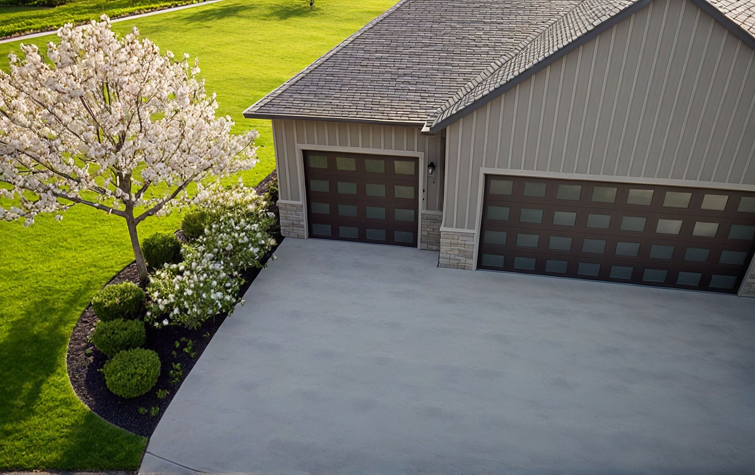 PromptPhoto of a modern residential garage, highlighting sleek architectural lines and a muted color palette. Emphasize the textured siding and stone accents, complemented by well-maintained landscaping featuring flowering trees and lush greenery. Set in a serene suburban environment, with open lawns and surrounding residential structures. Achieve soft, natural lighting of a clear day casting gentle shadows on the driveway, captured from a bird’s-eye view with a wide-angle lens to encompass the landscape and structure in harmonious detail.