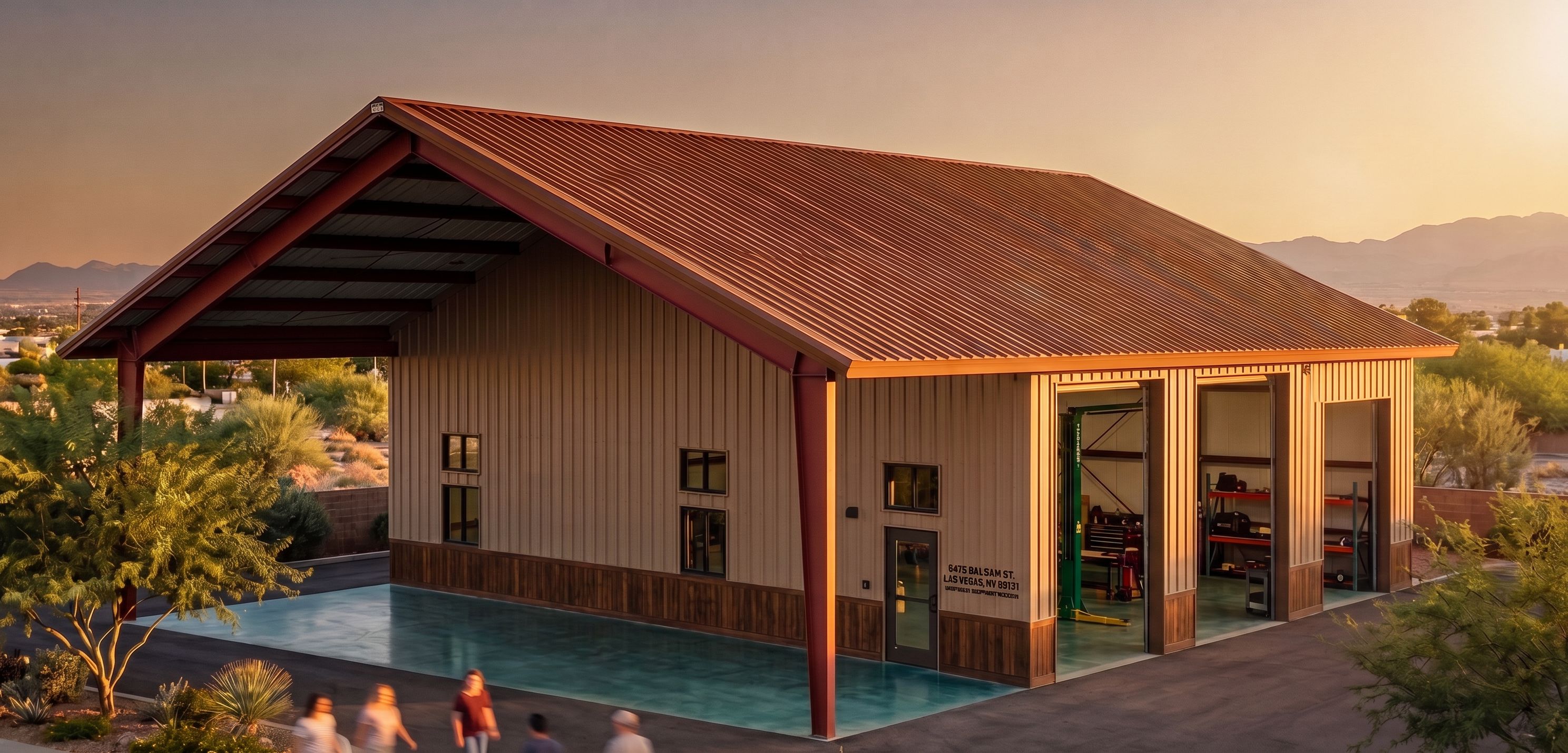 PromptAccessory Equipment Building located at 6475 Balsam St. Las Vegas, NV 89131. Windows and large steel rollup doors on side. Steel building with corrugated metal roof colored saddle up from sherwin williams color # 9099 trim to be Rustic Red from sherwin williams color number 7593 Wainscot is thermory brown wood paneling , keep exact camera angle