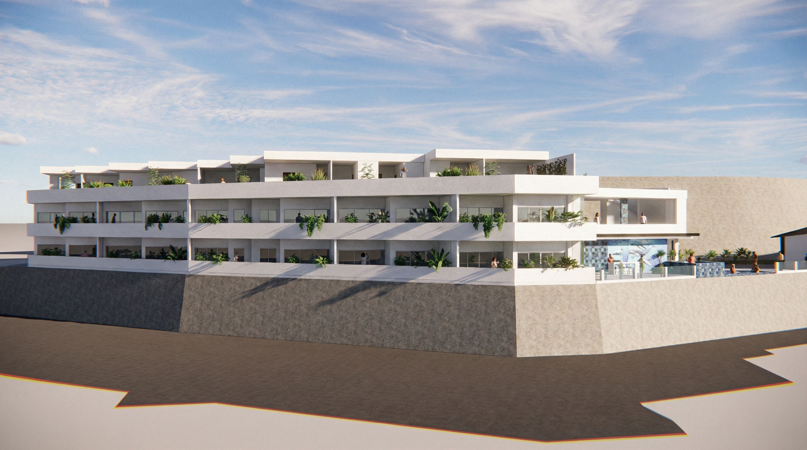 PromptPhoto of a modern multi-story residential building with flat peaks and extensive glass façades. Emphasize clean lines, white stucco finish, and greenery on balconies. Keep the structure and forms of the volume, increase the detail and the light, textures and shadows. , keep exact camera angle