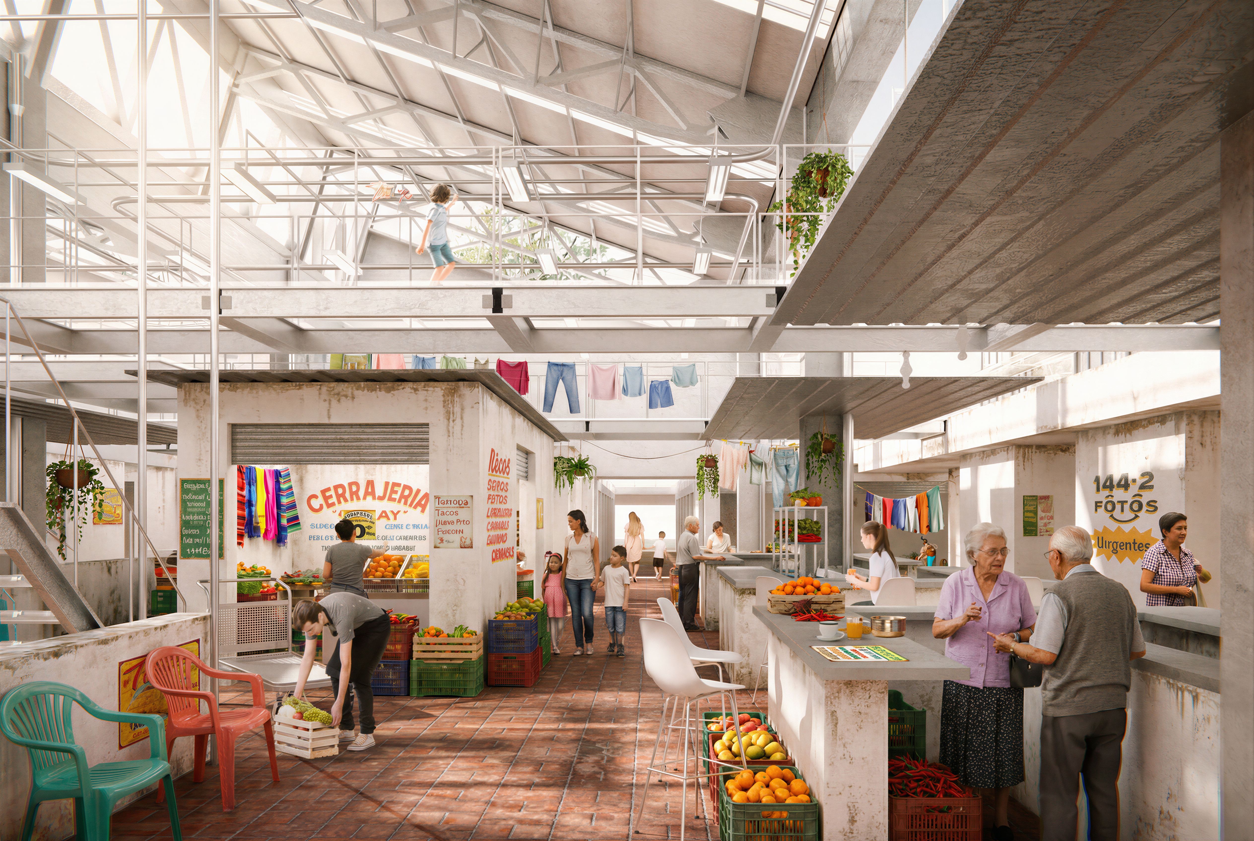 Photorealistic architectural interior of a Mexican affordable housing market corridor. Preserve the architecture, layout, structure, stalls, stairs, and camera framing exactly as in the reference render. Do not modify the building design or geometry. Enhance realism by introducing everyday Mexican market life: residents buying fruit, vendors arranging produce, people walking through the corridor, casual conversations, and small neighborhood activity. Add subtle details such as fruit crates, plastic chairs, handwritten signage, laundry hanging above, small plants, and everyday objects. Introduce warm color accents typical of Mexican markets through signage, products, fabrics, and small decorations while keeping the architecture unchanged. Add slight material wear such as stains, dust, and imperfections. Soft warm daylight, low contrast lighting, lively but natural atmosphere, documentary-style architectural photography.