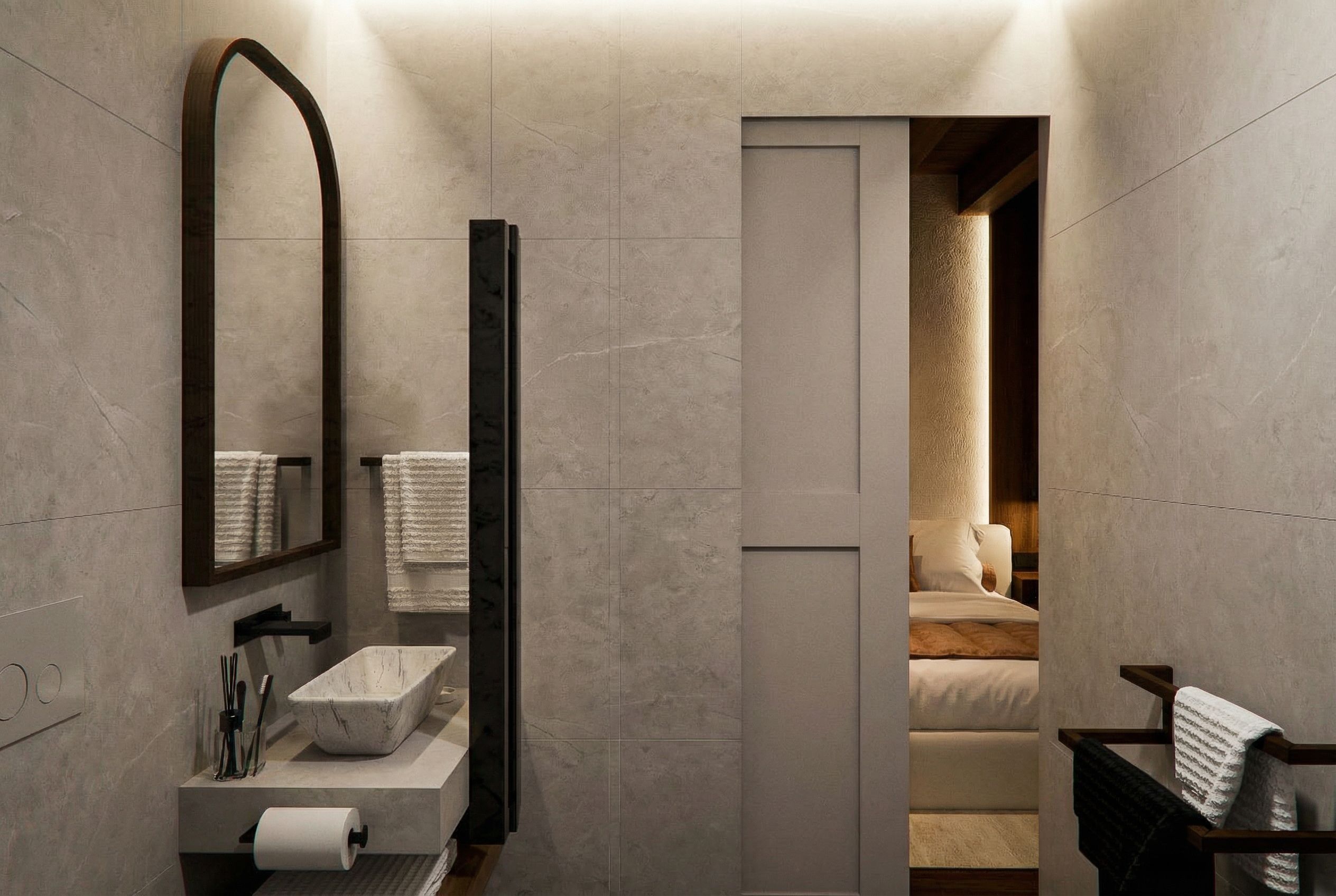 Highly photorealistic bathroom render based on the reference image, enhance image quality to high resolution, realistic interior lighting only with no sunlight or natural light, soft balanced artificial lighting ceiling lights or hidden LED, perfect exposure balance, clean reflections, realistic materials ceramic, glass, metal, sharp details, modern interior photography style, photorealistic, 4K, global illumination, no distortion, natural colors, professional interior photo, keep exact camera angle