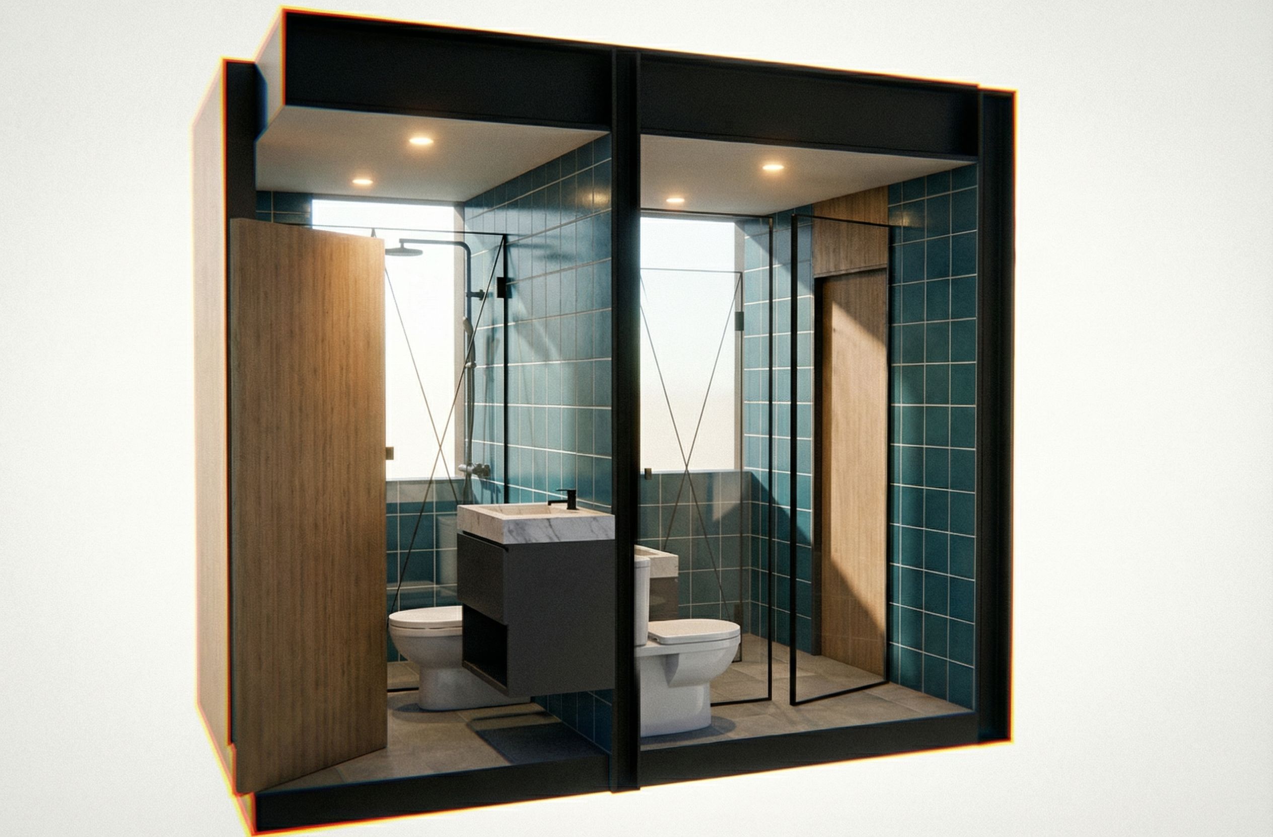 MADERA ROBLE, SUELO GRIS MEDIO, AZULEJOS DE 20*20 EN TONOS AZULES PROFUNDOS, SUELO GRIS 30*30 COLOR MEDIO , EN GENERAL MODERLNO, ELEGANTE, NO CMABIES LA PERSPECTIVA NI INTERPRETES VOLUMETRIA, keep exact camera angle