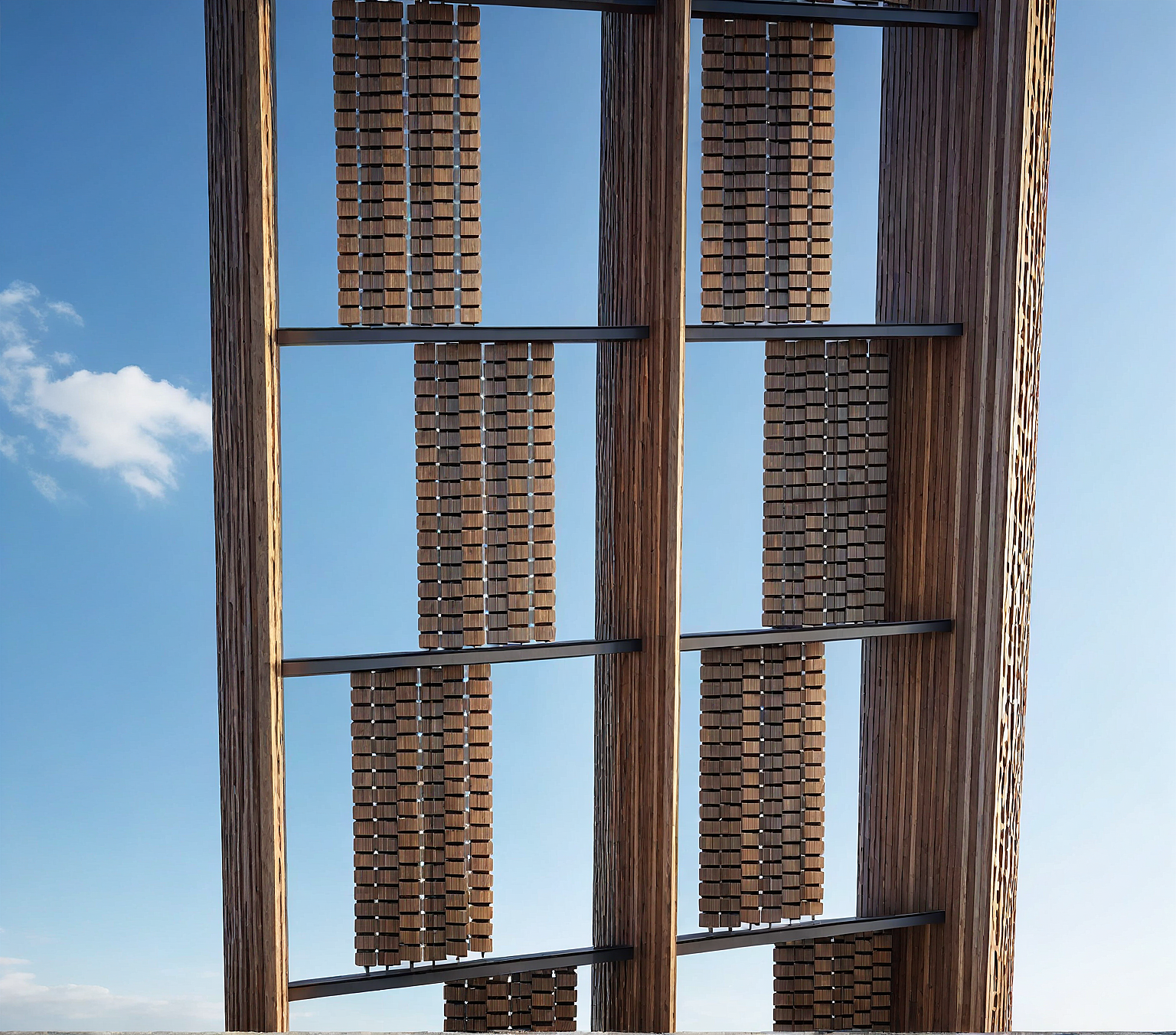 PromptTIMBER KINETIC FACADE , ENHANCE THE IMAGE , RENDER ONLY , DONT CHANGE THE DESIGN