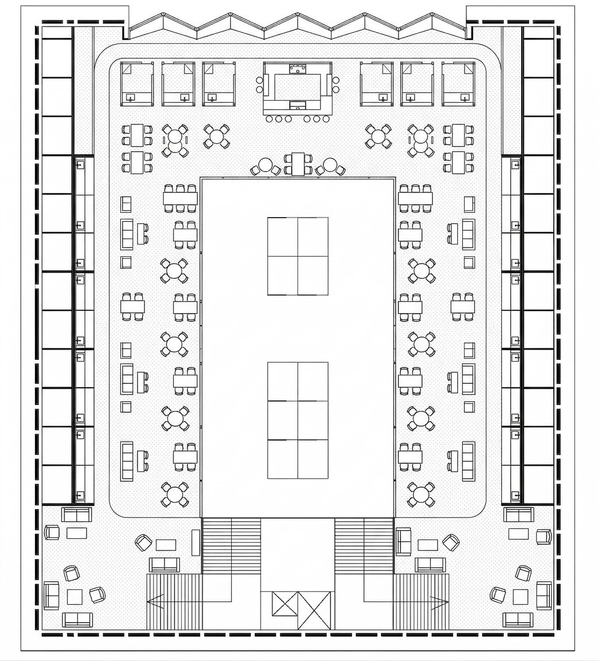 PromptRefine the upper floor (mezzanine gallery) of this market hall. Treat only the hatched area as the second floor. Keep the original building shape, symmetry, and layout strictly unchanged. The upper level is a partial mezzanine (gallery) with a central open void overlooking the ground floor Do not add walls or enclosed rooms — keep the space fully open Organize the space as a relaxation and refreshment zone with market character Include: small food stalls / counters (market-style) coffee bar / drink bar seating areas (tables, chairs, lounge seating) Arrange everything using furniture and light stall structures only, not solid partitions Keep the layout clear, structured, and readable, similar to a traditional market organization Maintain symmetry and original circulation logic Circulation follows the gallery edge (loop movement) Orient main seating and food areas toward the top side of the drawing, facing the glass façade and river view Balance between stalls and open seating space, avoid overcrowding The drawing is in scale 1:200, so all elements must have realistic architectural dimensions Use correct proportions for: stalls (approx. 2.5–3 m modules) tables and seating (real sizes) circulation paths (min. 2.5–3 m for main movement) Ensure the space reads as a large public interior, not a small room clean AutoCAD-style architectural floor plan black and white thin precise linework clear line hierarchy (walls, furniture, circulation) no perspective no text labels, keep exact camera angle