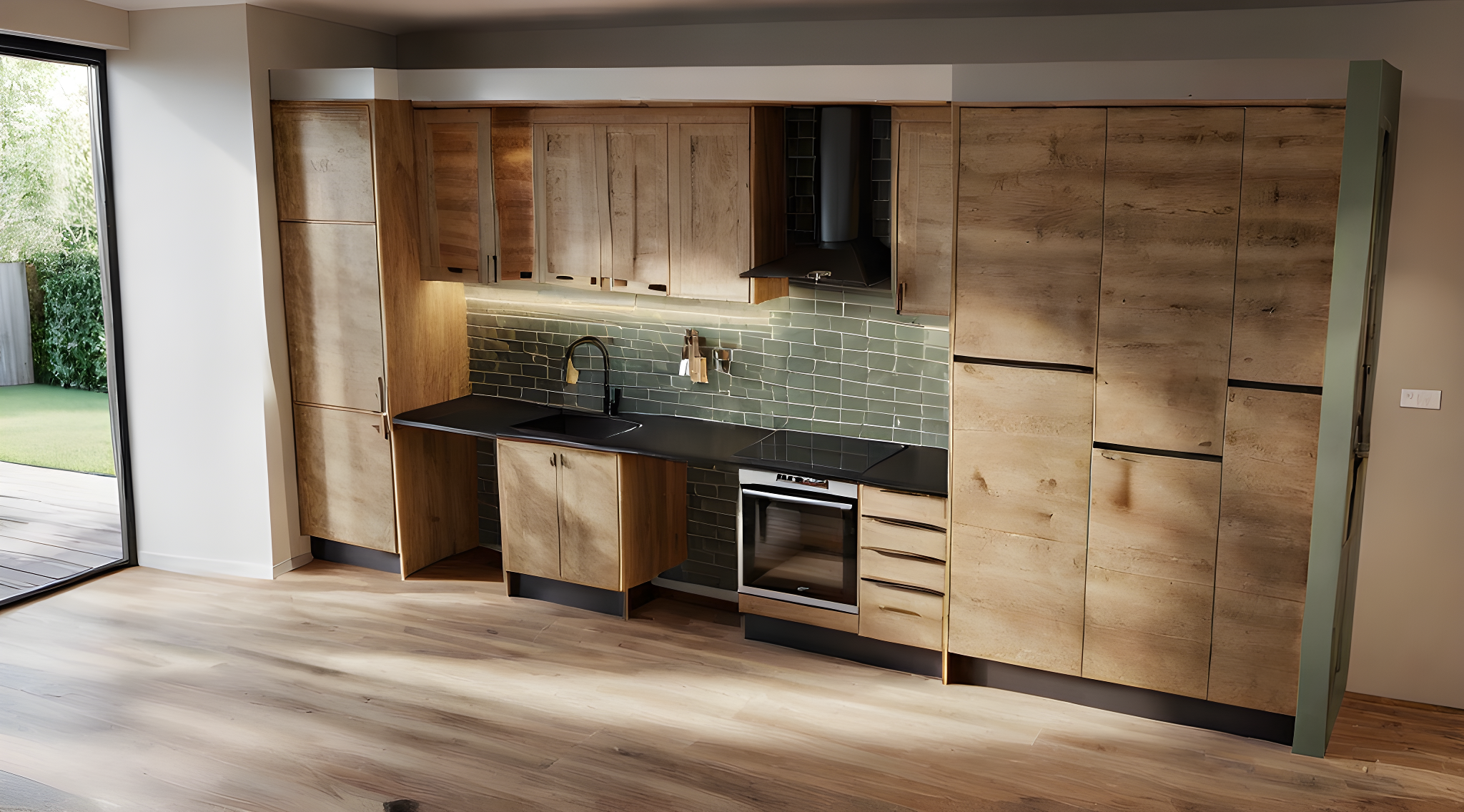 PromptSketch of a kitchen with wood cabinets. Backsplash with subway tiles color sage. black sink
