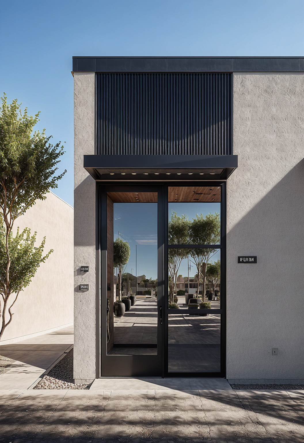 PromptArchitectural visualization of a hair salon's shopfront in Phoenix, Arizona, clear sunny sky mood, low planting shrubs, historic neighborhood, smooth concrete walkway.