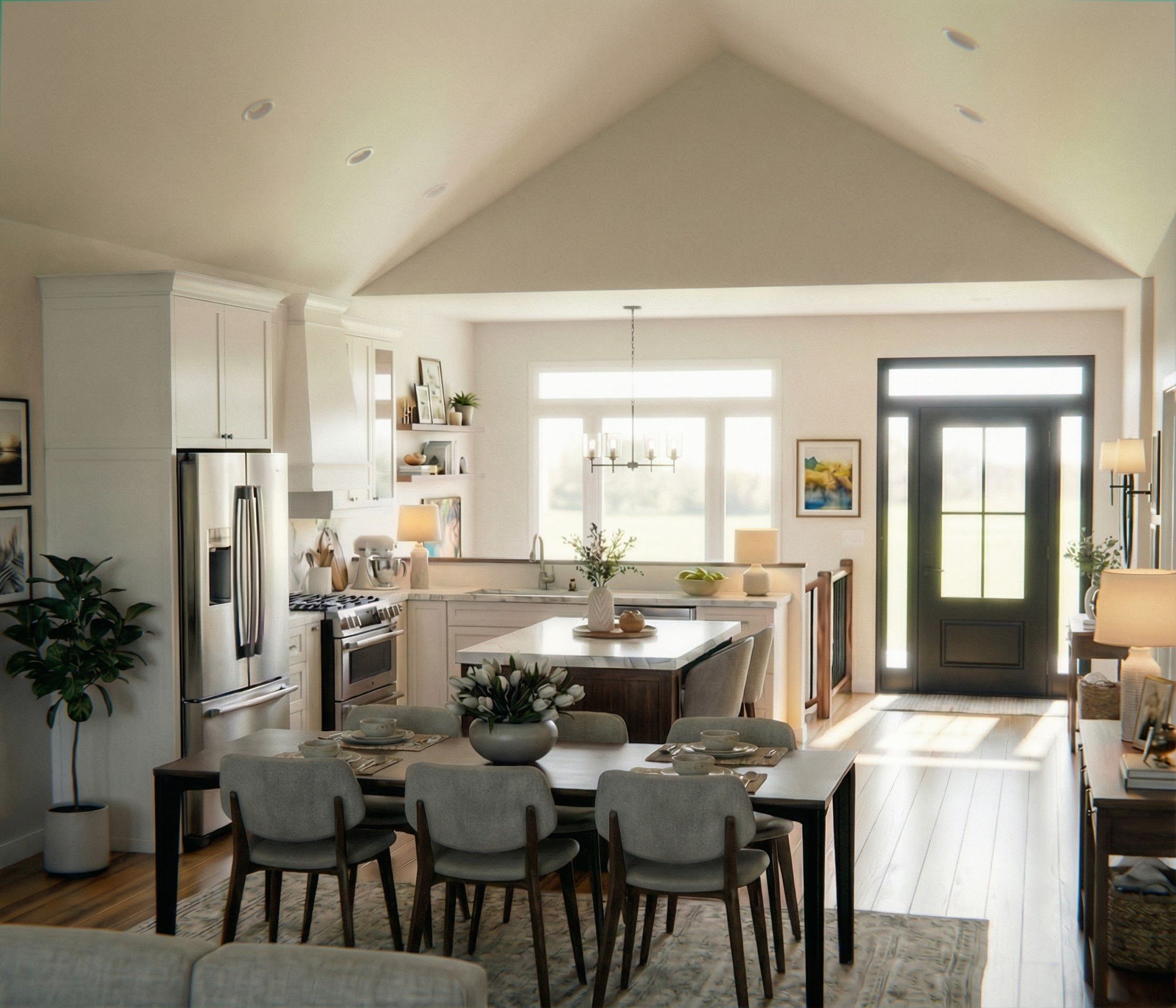 Promptblack style front door, small modern chandelier in front of the front window over the stairs, REMOVE THE ISLAND LIGHTS, , keep exact camera angle