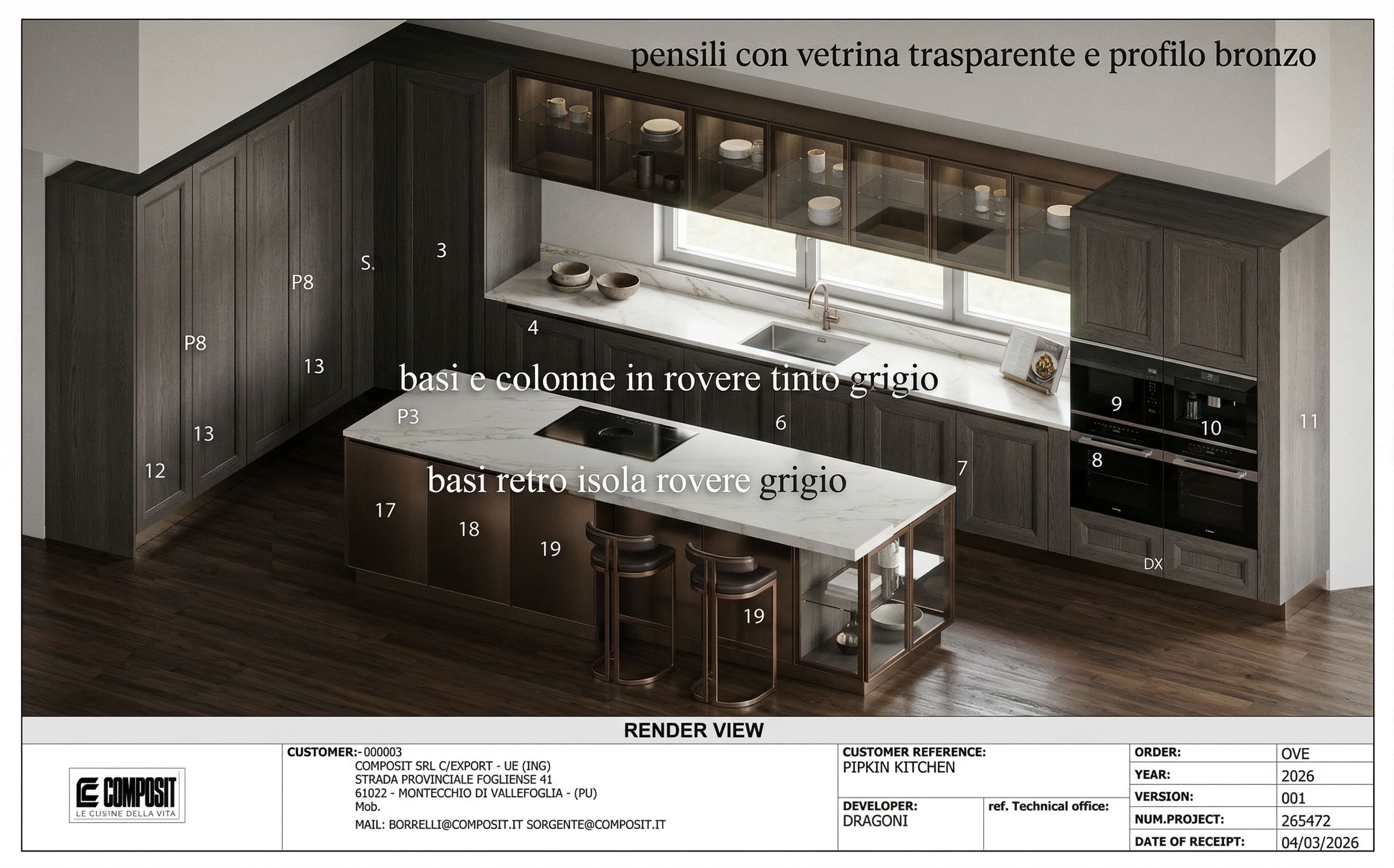 follow the intrsuctions on the plan. the island make some glass unit like in the plan short hight, and use full depth unit on the island on the other site, add abreakfast bar with stools in the middle, grey dark oak and island in bronze laquared, keep exact camera angle