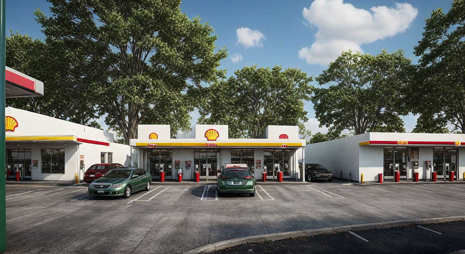 PromptEnhance this image of a shell petroleum station to a photorealistic, high-definition finish without altering layout, composition, or dimensions. Do not alter the gas pumps, and maintain all vehicles in initial image, the roof is black, and the road tarmac texture, modern landscape and HD, add the shell logo to the building, use red and yellow accent colours, keep the green areas as grass, store front glass clear and HD, car colours dark red, silver and black