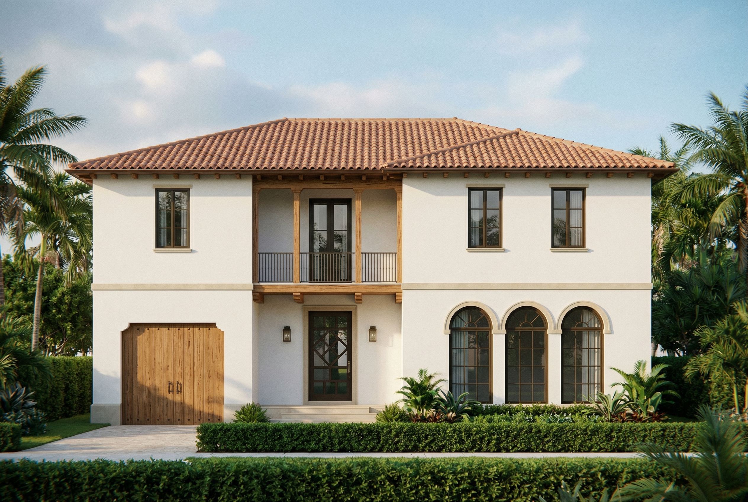 PromptCreate a photorealistic, cinematic, dreamy architectural rendering based strictly on the provided front elevation drawing of a Spanish Colonial style house in Palm Beach, Florida. Camera must remain EXACTLY the same as the provided elevation: straight-on front elevation view, perpendicular (90°) to the facade, no perspective, no 3/4 angle, no camera tilt, no wide-angle lens, no depth distortion, no vanishing points. Do not change the camera angle, composition, or geometry. The entire front facade must be centered and flat to the camera like an architectural elevation, but rendered photorealistically. Materials and finishes: – Main body of the house: smooth white stucco – Solid grey elements: beige cast stone – Window frames and front door: dark bronze – Front door: glass panels – Balcony railing: wrought iron – Roof: Spanish barrel clay tile – Wooden elements (garage door, balcony columns, beams, rafter tails): pecky cypress wood Refer closely to the architectural details in the elevation. Use the other two reference images strictly for material and color inspiration only, not for changing geometry or camera angle. Lighting should be soft natural daylight, warm, slightly dreamy and cinematic, but with no perspective lens effects. Ultra photorealistic materials and realistic shadows., keep exact camera angle
