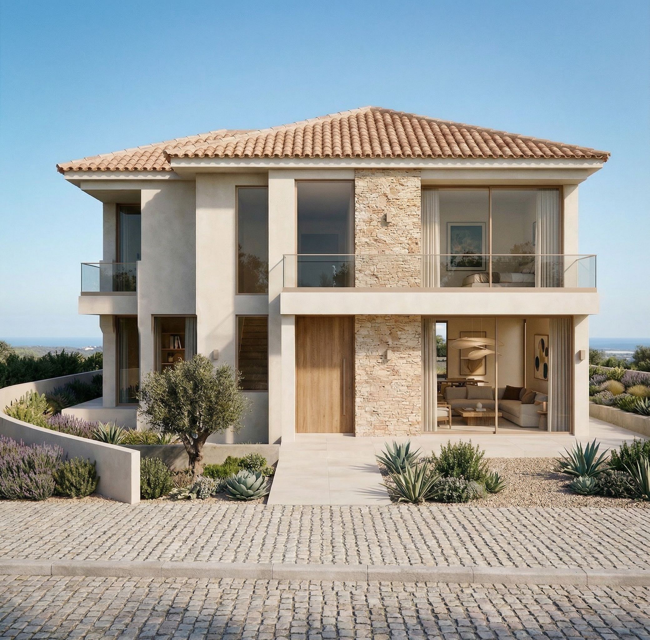 Promptremove olive trees out of the boundaries and use cobblestone in the paving outside too. boundary in the fton is wrong, remove from the image. remove garage too. , keep exact camera angle