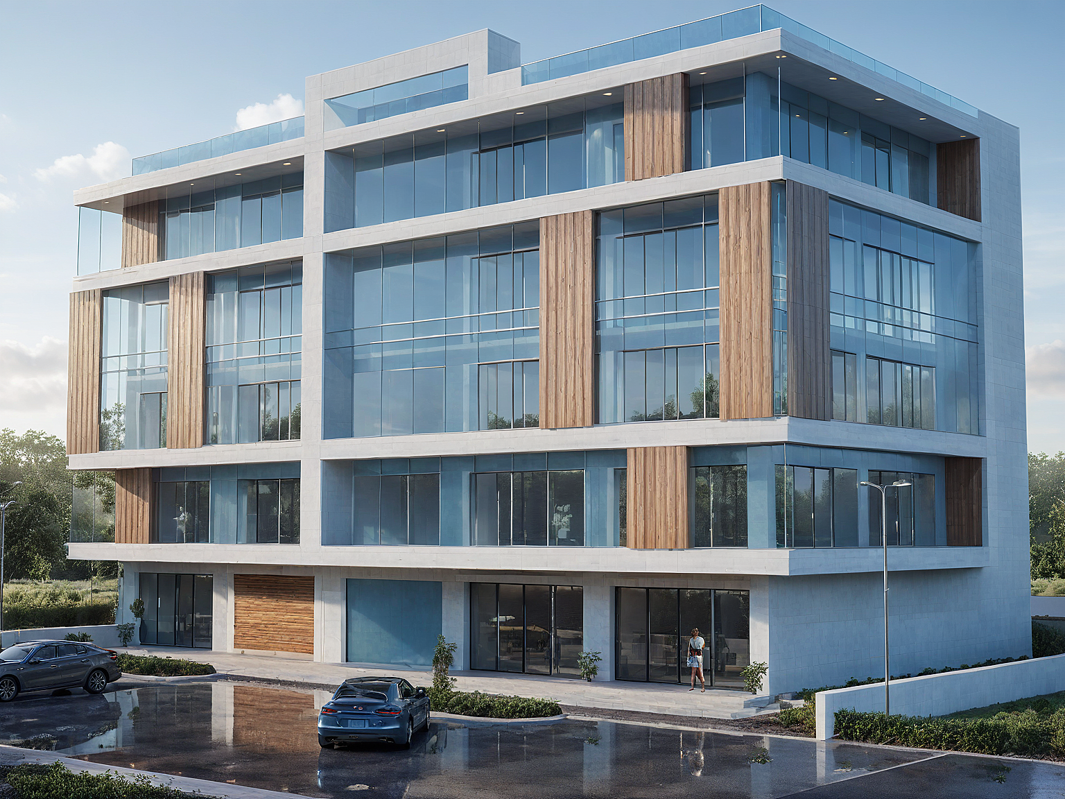 The Architecture image describes a public building entrance featuring a futuristic design in misty blue acrylic. The structure’s sleek, organic curves harmonize with the surrounding landscape, while soft light filters through hazy summer afternoon skies, casting gentle reflections. A quaint cottage nearby adds a touch of realism. glass reflection , commercial building.