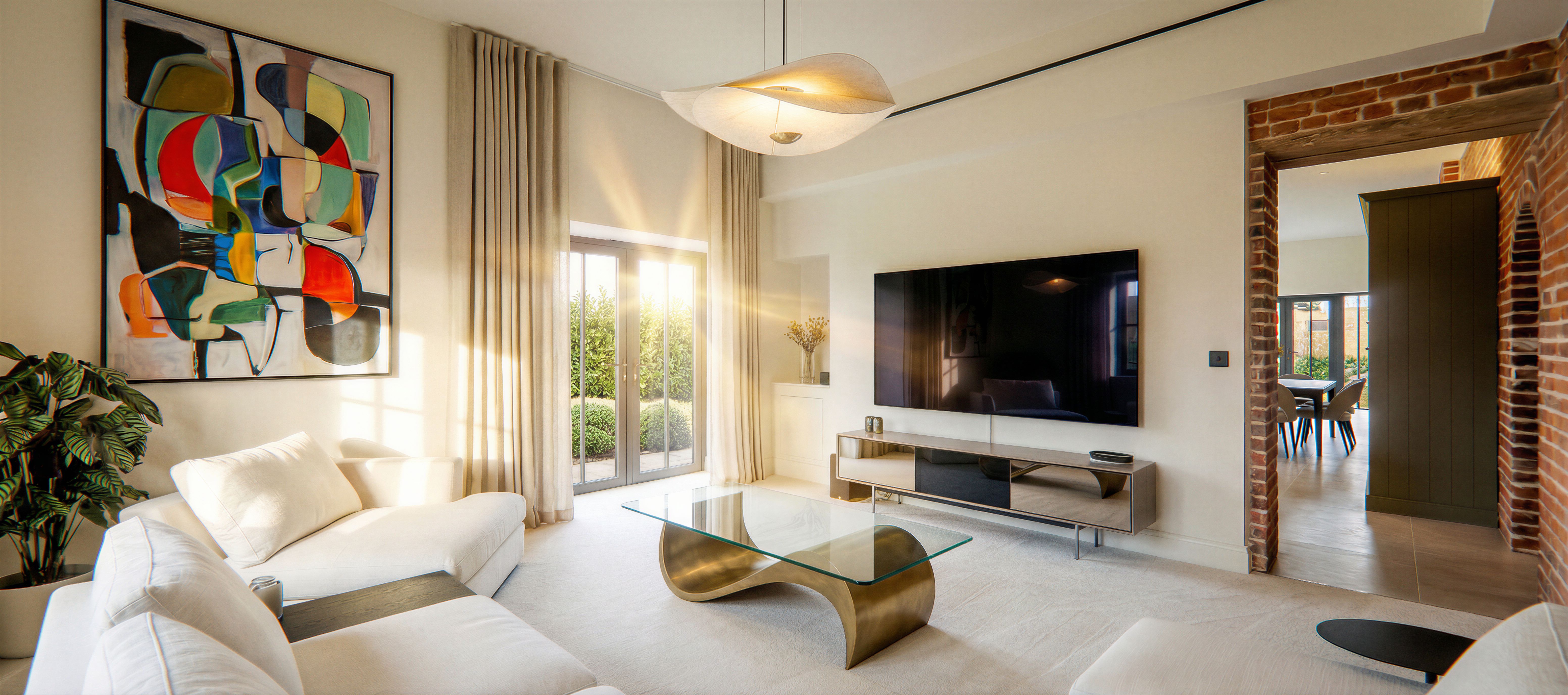 Promptmove light fitting to centre, add coffee table, dining furniture through opening , keep exact camera angle