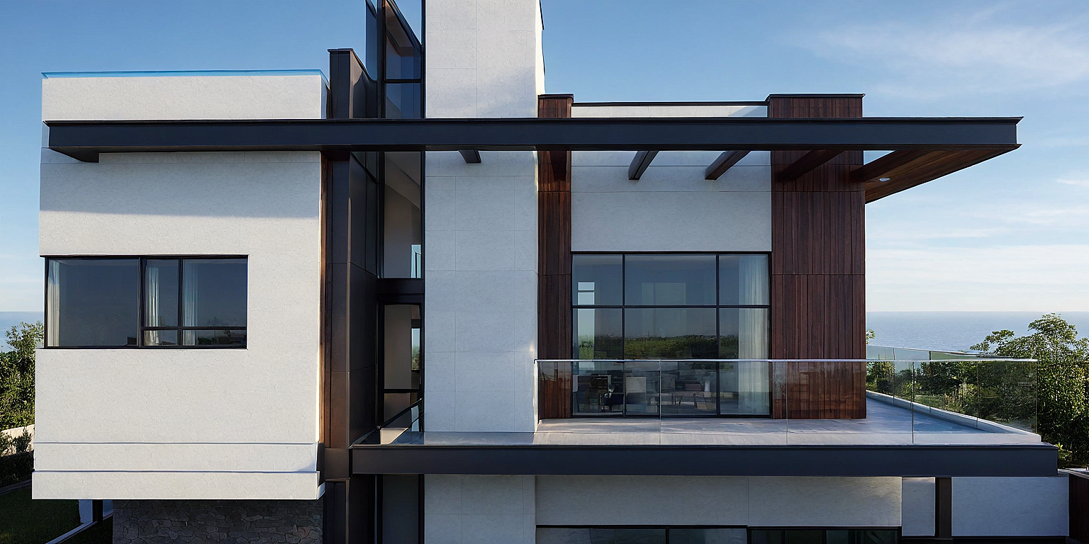 The house exhibits a contemporary design with clean lines, flat rooflines, and large expanses of glass. combination of light-colored stucco, dark-toned wood, and possibly some stone or tile accents. The house presents a modern and luxurious ACCENTS he use of contrasting materials and clean lines creates a visually striking and sophisticated appearance.