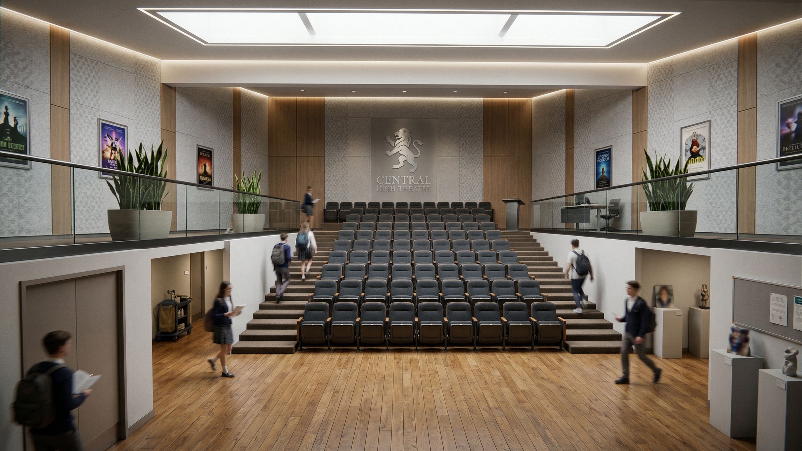 Promptmake this scene a theater with chairs that hold the audience in high school and do simple interior design and make the hall look super realistic