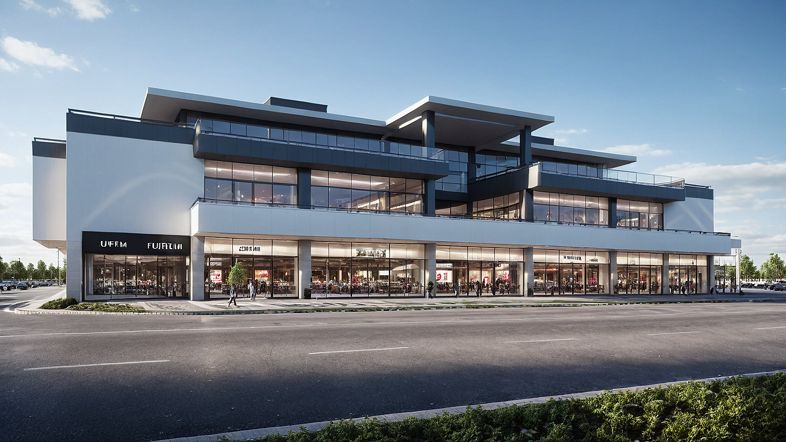 Promptshopping mall, cars, trees, people, realistic rendering, modern facade, realistic sky, parked cars, lighting on the facade, small trees in front of the building, people walking, cars passing by