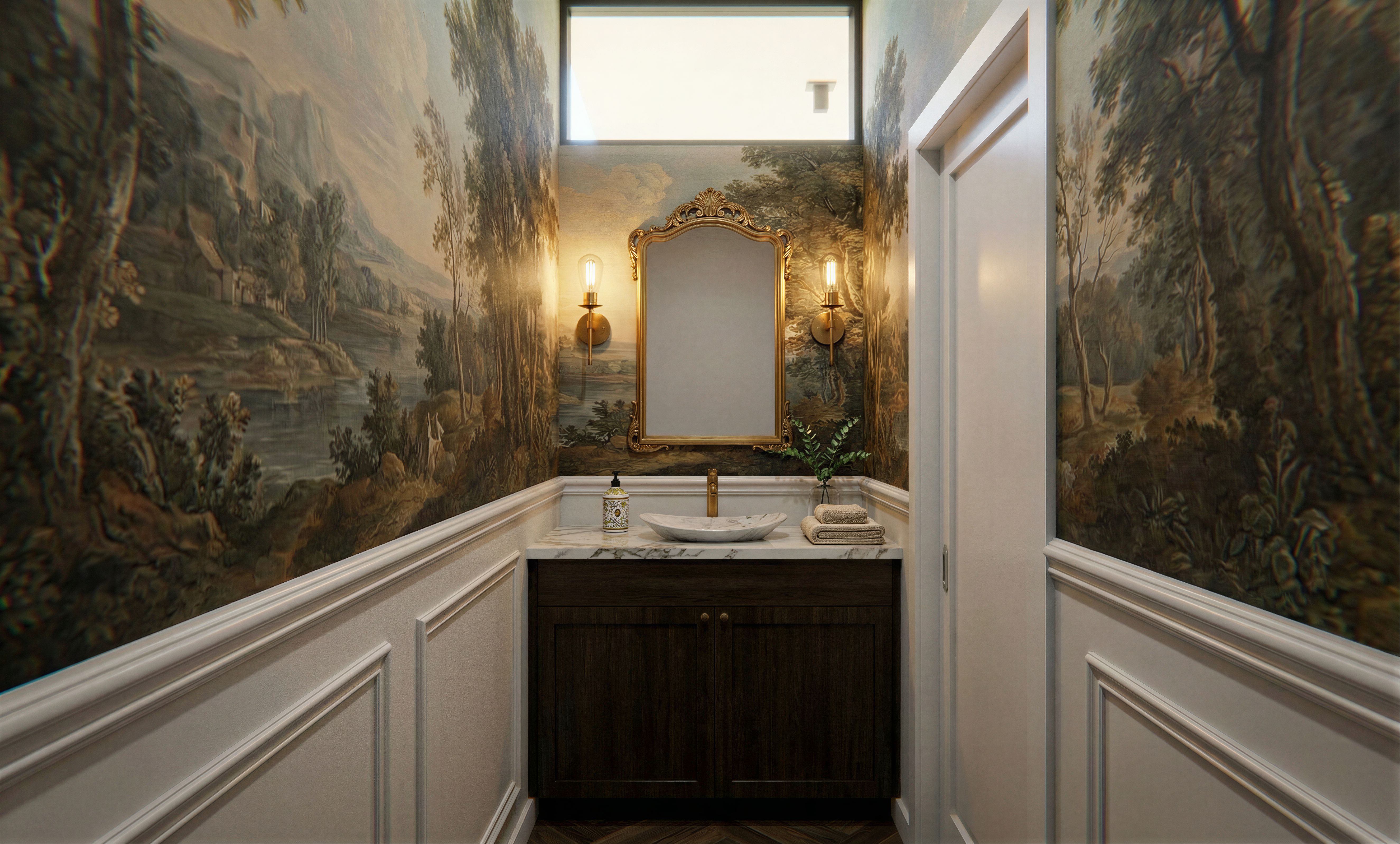 create luxury powder room with classic and modern style mix, add mirror and light fixtures, ad mural on side walls, add misc. items as appropriate, keep exact camera angle