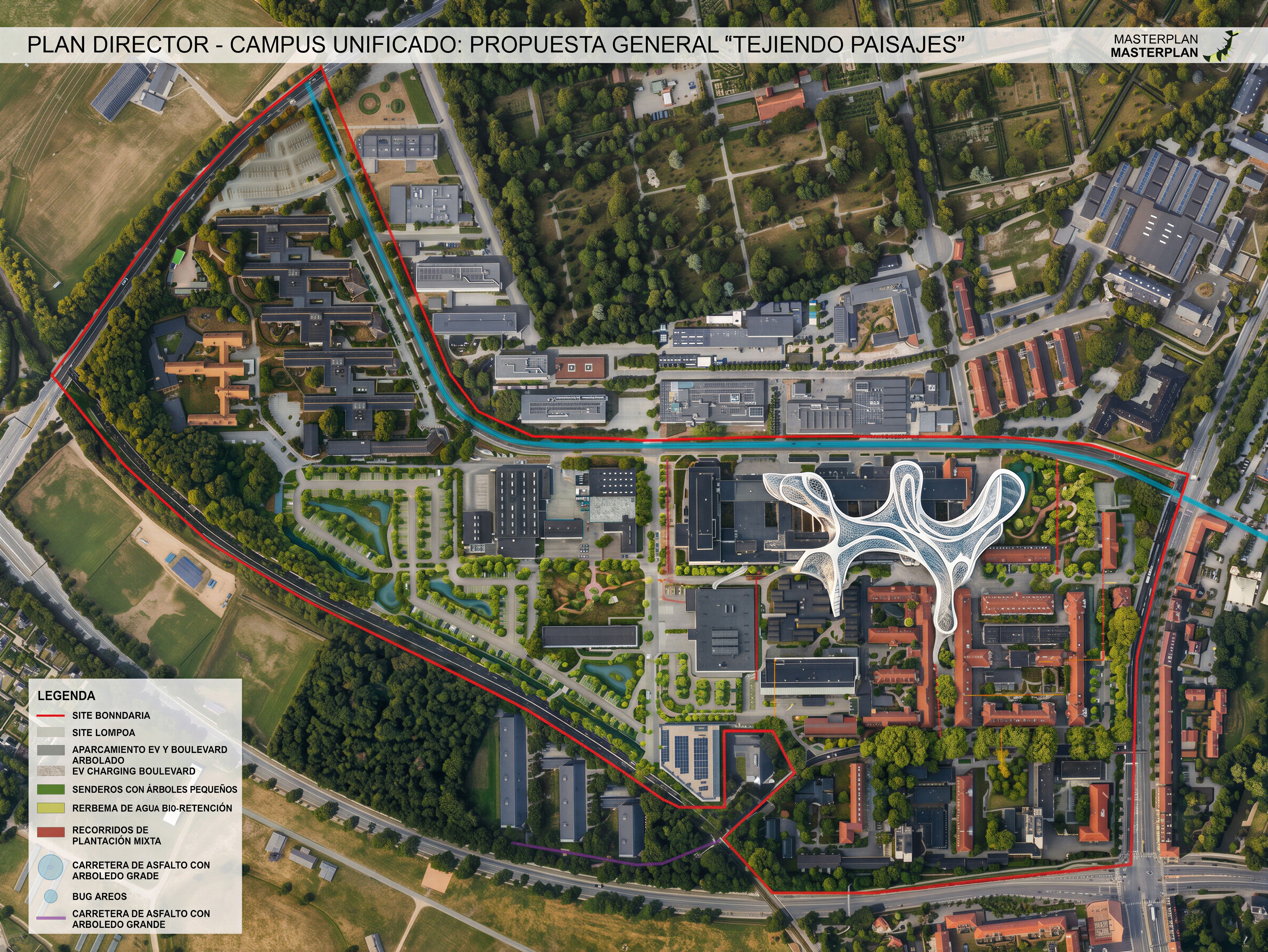 EnhancedPromptEdit this image. CREATE A MASTERPLAN IN A SIMILAR GRAPHIC STYLE TO THE MASTERPLAN IN THE "ATTACHED" REFERENCE IMAGE 1. Add rows of trees with foliage along the straight yellow line to the plan, along with some electric car parking and charging points and bus benches. Add small trees along the green "paths." Add mixed plantings along the "red" paths. Add a black asphalt road with traffic lines and large trees along the "purple" path. Add white "ergonomic" metal and glass roof structures, like the ergonomic glass structures in "Reference Image 2," corresponding to the "blue circles with orange lines." Add green tree-lined parking lots and "ergonomic" water features corresponding to the transparent "yellow" fields. All new structures must be continuous and must integrate appropriately with the landscape., keep exact camera angle
