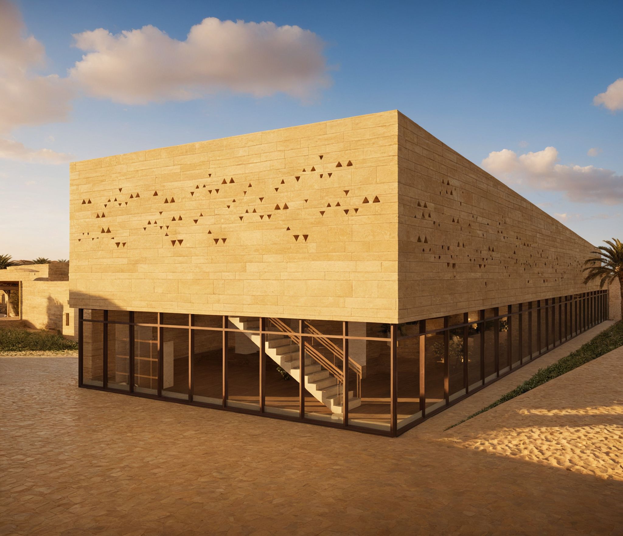 PromptA realistic architectural render of a modern stone building inspired by Najdi architecture, with warm golden lighting similar to late afternoon in Riyadh. The atmosphere feels calm and elegant, with soft shadows, detailed Riyadh stone texture, subtle reflections on glass, and a balanced tone. The design, proportions, and materials remain exactly as in the input image, with a realistic professional-photography style like the Diriyah architecture visuals.