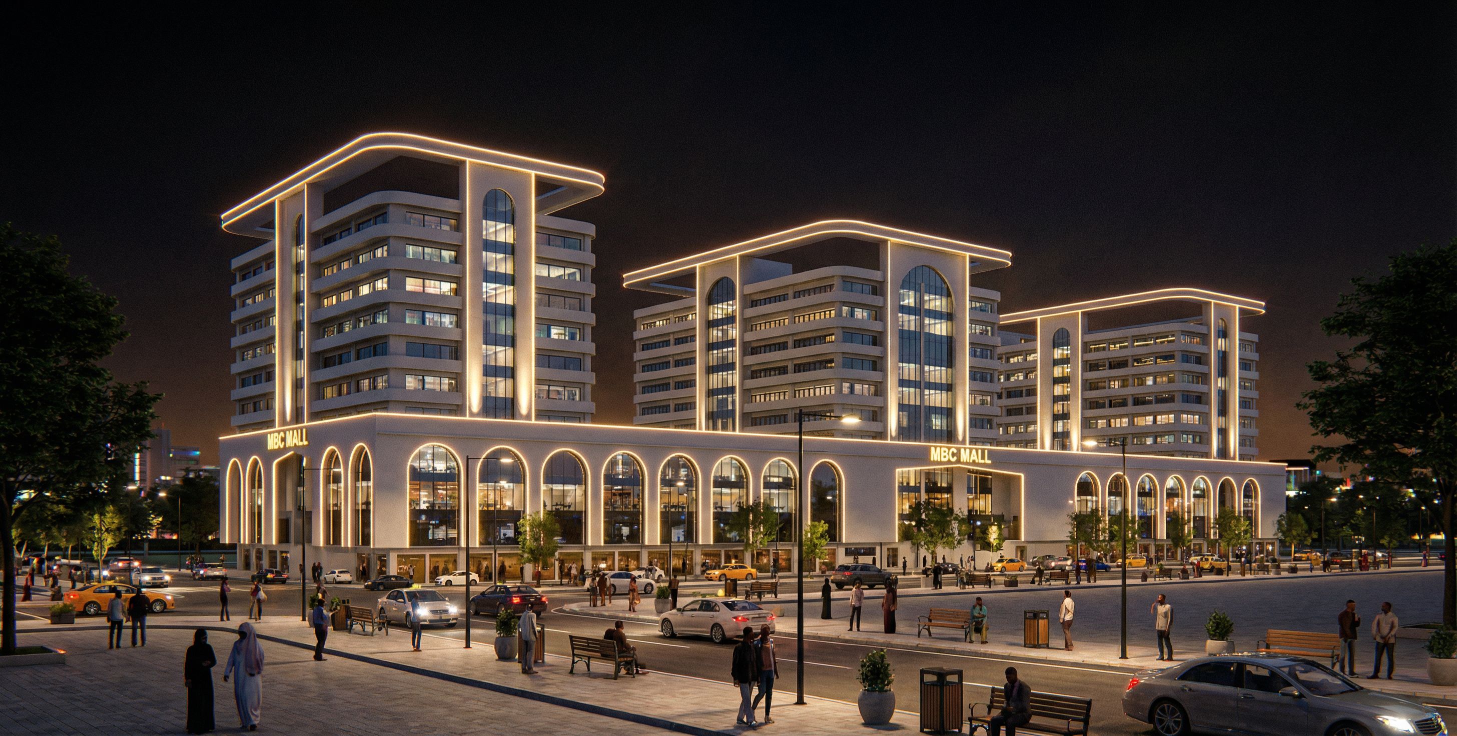 IMAGE SHOWING A MALL WITH GROUND FLOOR AND THREE COMMERCIAL FLOORS AND THREE TOWERS FROM 4TH TO 1OTH FLOORS. MAKE THE GLASS CLEAR REFLECTIVE AND REALISTIC. TURN ON THE LIGHTS IN THE BUILDING. INCLUDE ROPE LIGHTS, SPOT LIGHTS AND STREET LIGHTS IN THE BUILDING. THE PEOPLE ON THE STREET SHOULD BE OF SOMALI ORIGIN. USE WHITE WALL MASTER ON THE BUILDING. INCLUDE NAME "MBC MALL" ON THE BUILDING. , keep exact camera angle