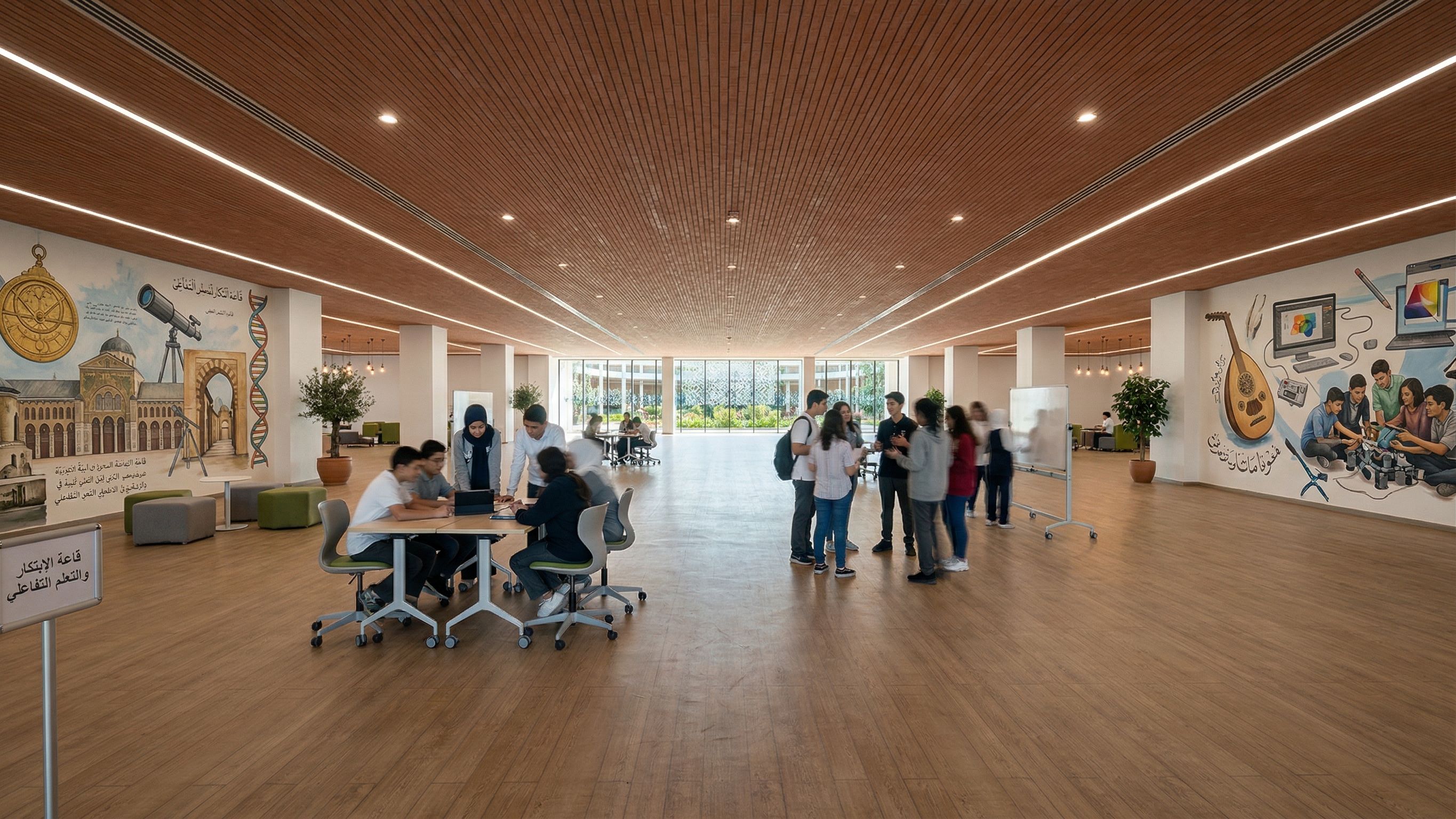Promptit is the interior 0f a modern Syrian (ARAB) school and it shows the inner interactive school add students interactive and add murals of high school related to and make the scene super realistic, keep exact camera angle