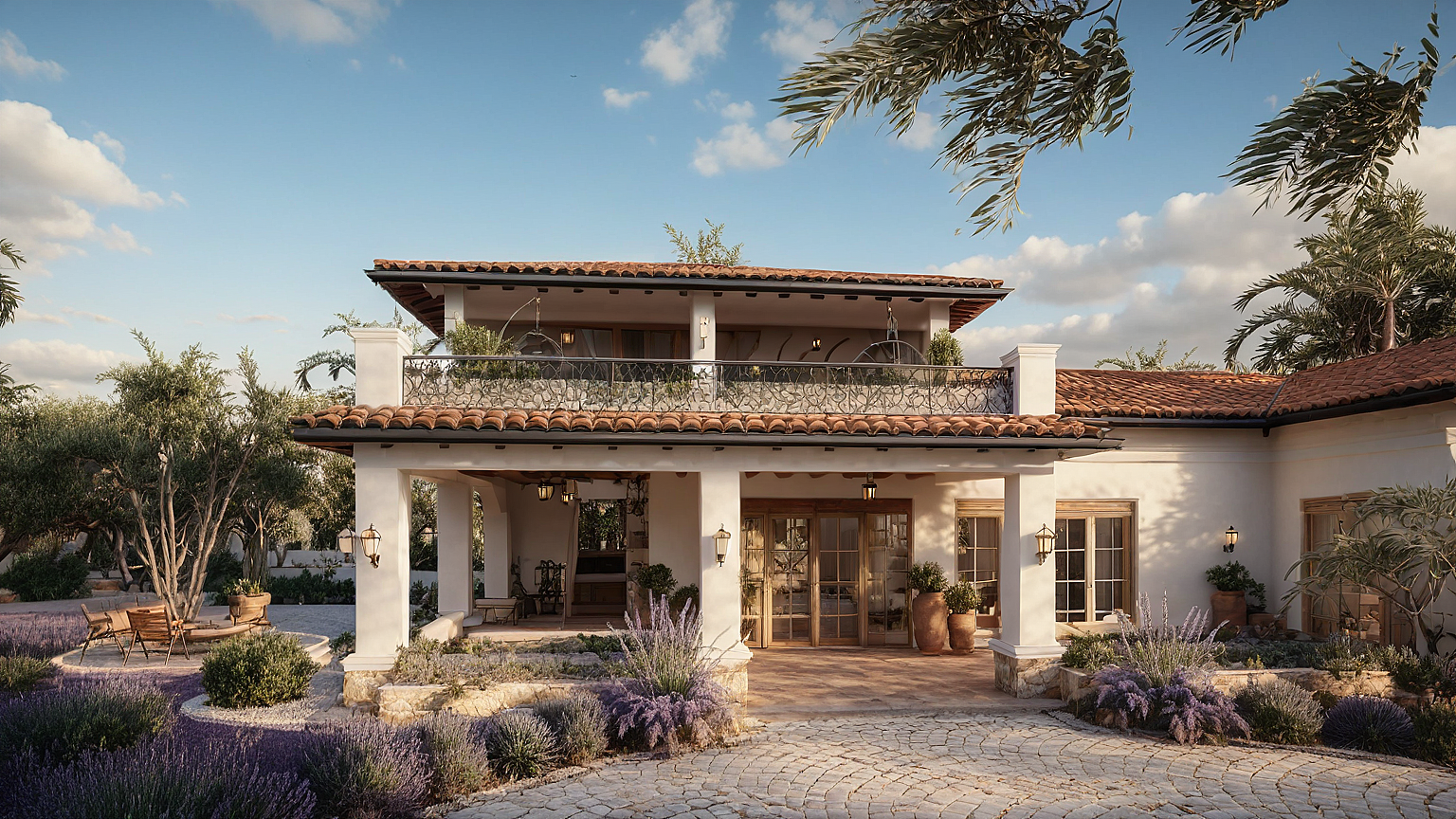 PromptHyper-realistic render of a Mediterranean-style bungalow with terracotta roof tiles, white stucco walls, arched windows, wooden shutters, and a stone-paved patio. Surrounded by olive trees, lavender bushes, and a sea view in the background. Golden hour lighting, realistic shadows and reflections, 8k resolution, cinematic composition, ultra-detailed textures with warm lamp lights, maintain balustrade on first floor