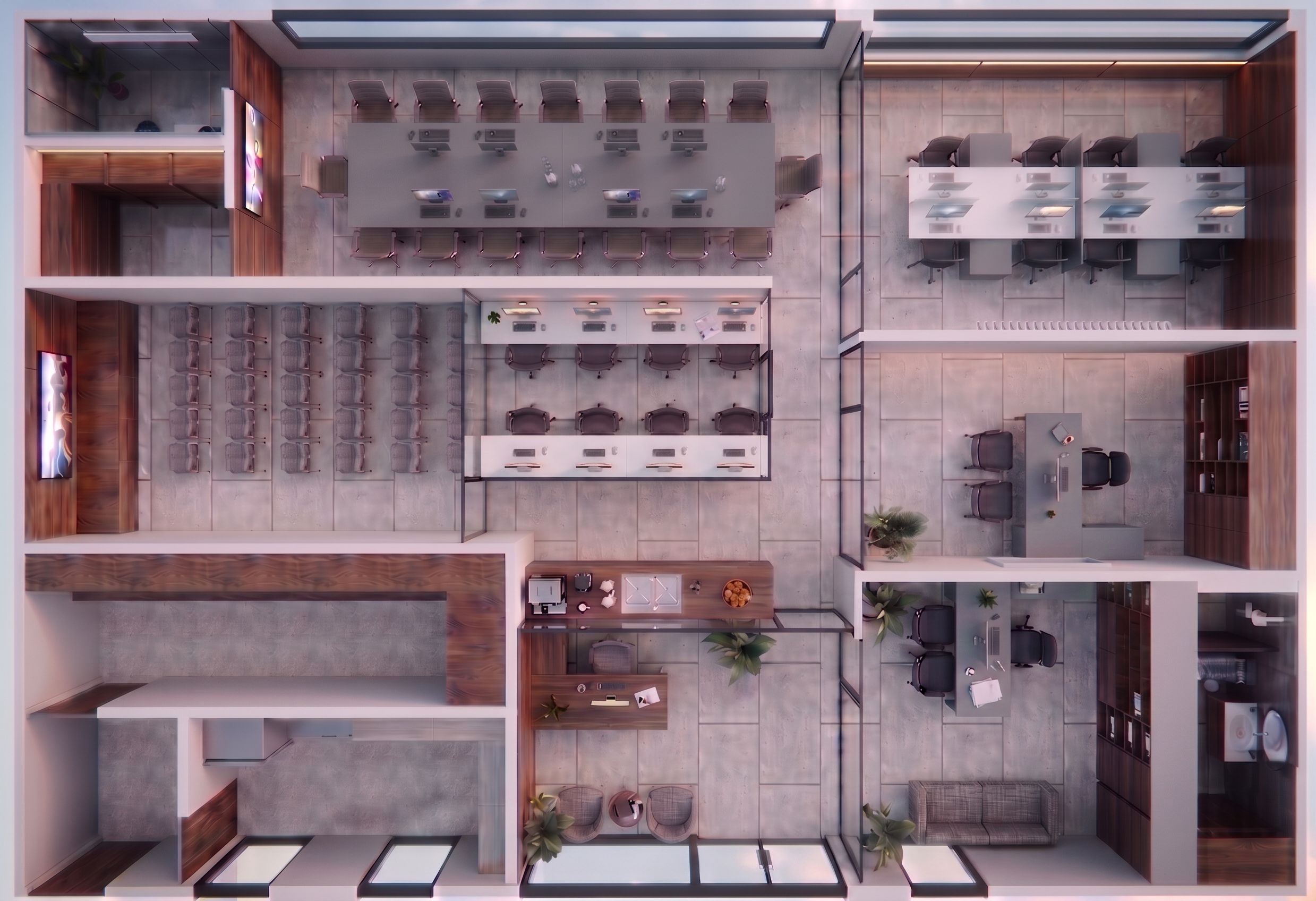 Puedes cambiar a color gris medio los 3 escritorios de un solo puesto de trabajo, no modifiques ni cambies más nada , keep exact camera angle
