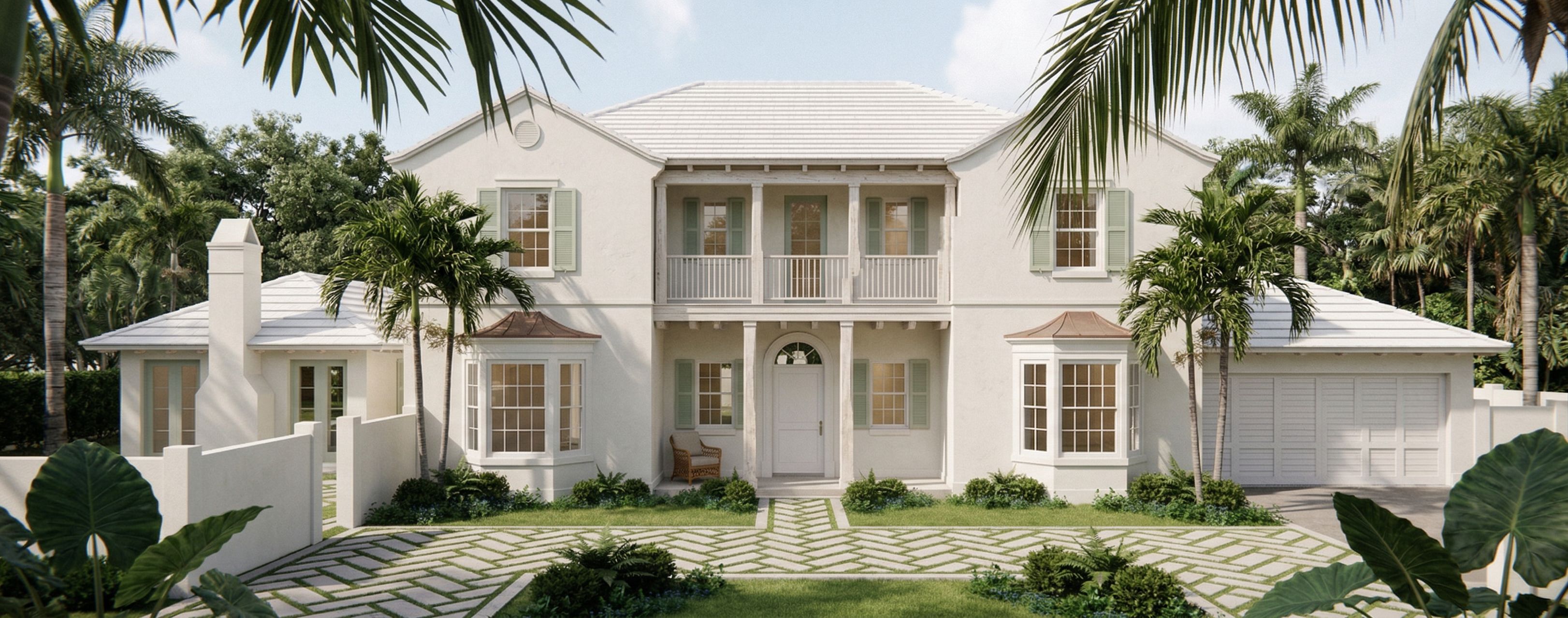 Ultra-photorealistic enhancement of the provided architectural rendering. π¨ ABSOLUTE RULE MOST IMPORTANT Preserve the exact architecture from the input image. Do NOT change: massing proportions roof forms window/door placement balcony design columns or details Do not reinterpret or redesign anything. Only enhance realism. πΈ CAMERA Centered on front door axis Symmetrical composition Slight perspective not flat elevation Eye-level, slightly closer to the house Natural lens 50mm feel Vertical lines perfectly straight π Should feel like: standing in front of the home, not viewing a model π΄ ENVIRONMENT CRITICAL β THIS FIXES THE βFAKEβ LOOK Transform the setting into a real Palm Beach residential environment Add: mature palm trees tropical vegetation layered greenery behind and around the house Introduce foreground framing: palm fronds entering from top edges a tree branch partially overlapping frame Background: soft tree line not empty sky no flat horizon or blank space π House should feel embedded in landscape, not isolated π€ LIGHTING INTIMATE + NATURAL Time: lit surfaces .slightly diffused sunlight Gentle shadow variation across faΓ§ade Subtle dappled light like filtered through trees Interior: soft warm glow not visible inside π Avoid dramatic or overly even lighting π§± MATERIALS REALISM β NO PLASTIC LOOK Stucco White Dove: warm off-white matte subtle grain + micro shadowing slight natural irregularity π² WOOD FIX THIS HARD White-washed pecky cypress: pale neutral driftwood tone NO orange, NO yellow visible grain + pecky texture slightly weathered, dry, matte π ROOFING Main roof: white concrete tile soft variation depth between tiles Bay roofs: aged copper muted, slightly patinated not shiny or saturated πͺ DETAILS Windows: white aluminum, subtle reflection Shutters: muted soft green Fresh Dew Doors: painted white wood, satin finish πͺ¨ HARDSCAPE Keep pattern EXACT Add: tonal variation slight wear realistic joints Grass: slightly imperfect not uniform π± LANDSCAPING Keep layout EXACT Refine into: luxury but relaxed Palm Beach planting Add: variation in plant size soft edges slight asymmetry π Avoid overly designed or symmetrical look π‘ LIVED-IN TOUCH VERY SUBTLE Add ONE small element: bicycle leaning OR chair slightly angled OR small object near entry π Should feel: someone just stepped inside π― FINAL GOAL Create: an intimate, high-end residential photograph β not a render It should feel: real grounded warm human NOT: staged perfect or artificial π₯ FINAL CONTROL LINE DO NOT SKIP βMaintain strict architectural fidelity to the input image. If any geometry changes, regenerate. Prioritize realism, natural materials, and environmental integration over stylization.β do not crop the image