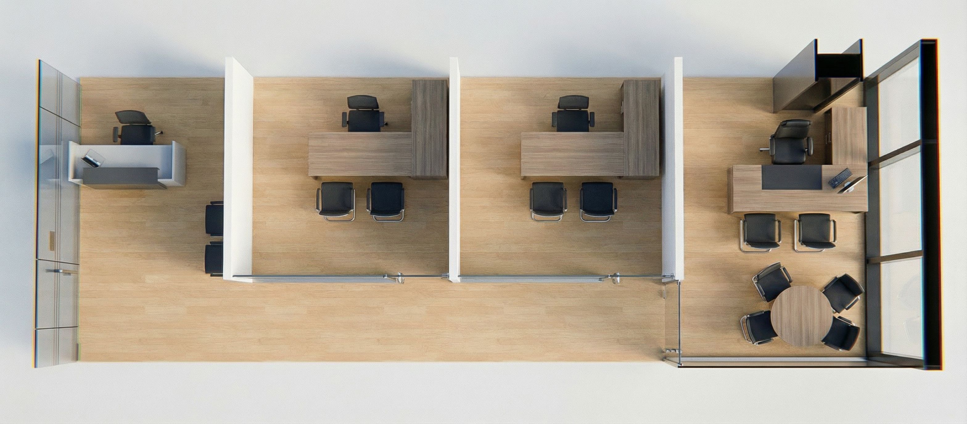 Use the provided image strictly as locked base geometry. Preserve exactly all room dimensions and layout proportions: Reception 2.20 m Office 1: 2.70 m Office 2: 2.70 m Office 3: 2.62 m Total width 3.02 m including 0.90 m corridor. Do not move walls. Do not resize rooms. Do not modify corridor width. Do not change wall thickness. Maintain construction logic: Transverse partitions are 10 cm drywall. Longitudinal partitions parallel to corridor are tempered glass with aluminum frames. Office 1 and Office 2 have longitudinal glass doors. Office 3 door is transverse and cuts the corridor. Improve realism only: Refine material textures. Improve lighting balance. Add subtle shadow depth. Maintain identical furniture placement. Camera must remain top-down orthographic aerial view. No perspective distortion. No layout reinterpretation. No added elements. No dimension text. Treat geometry as CAD-locked plan. Only enhance realism. Zero geometry transformation. No scaling. No stretching. No spatial reinterpretation.