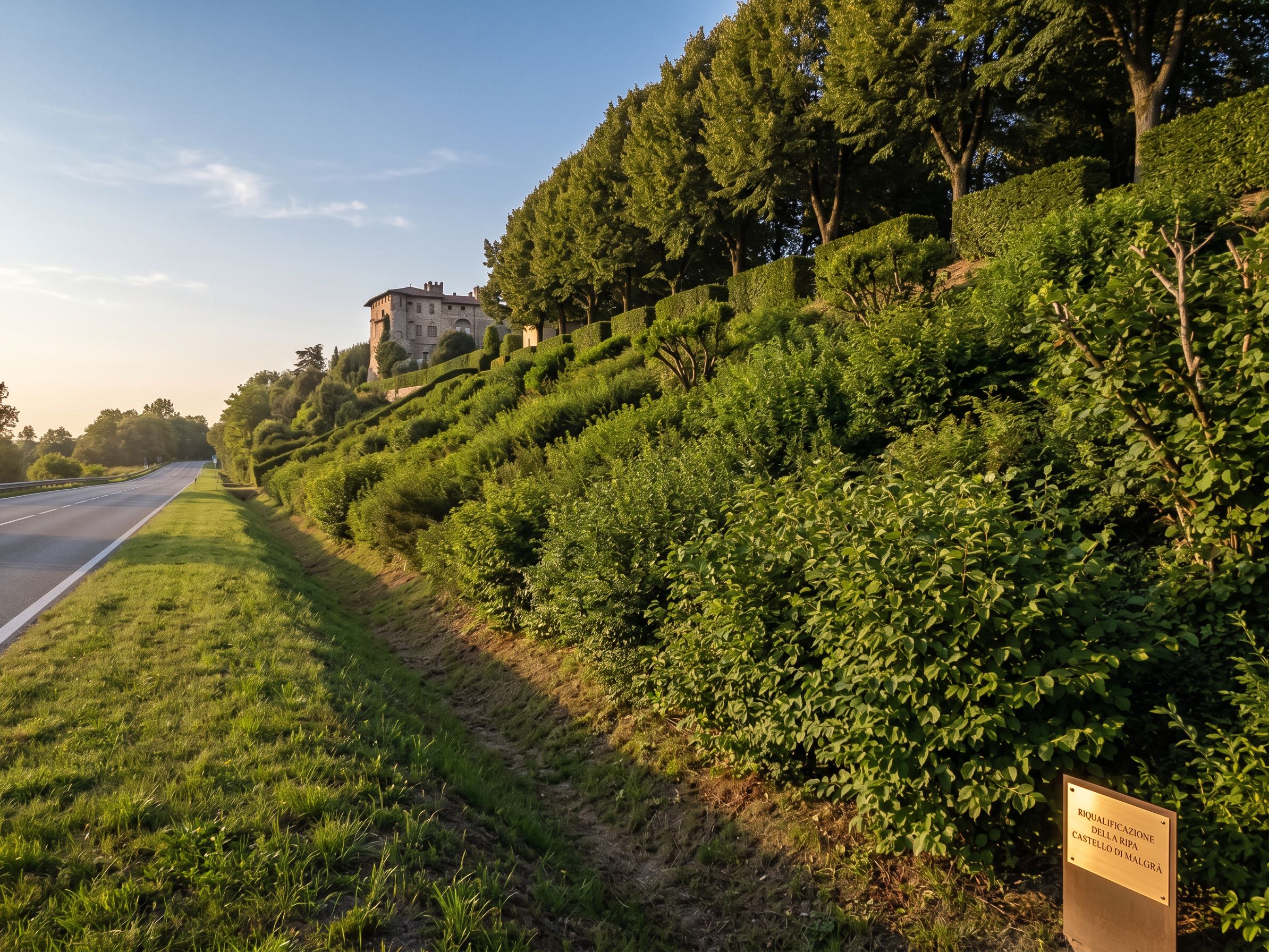 PromptCambiamento de panorama della ripa con sfondo il castello di Malgrà : - parte alta viale di Olmi e siepi di carpini - versante manto verde di arbusti autoctoni come il Sanguinello e Nocciolo, keep exact camera angle