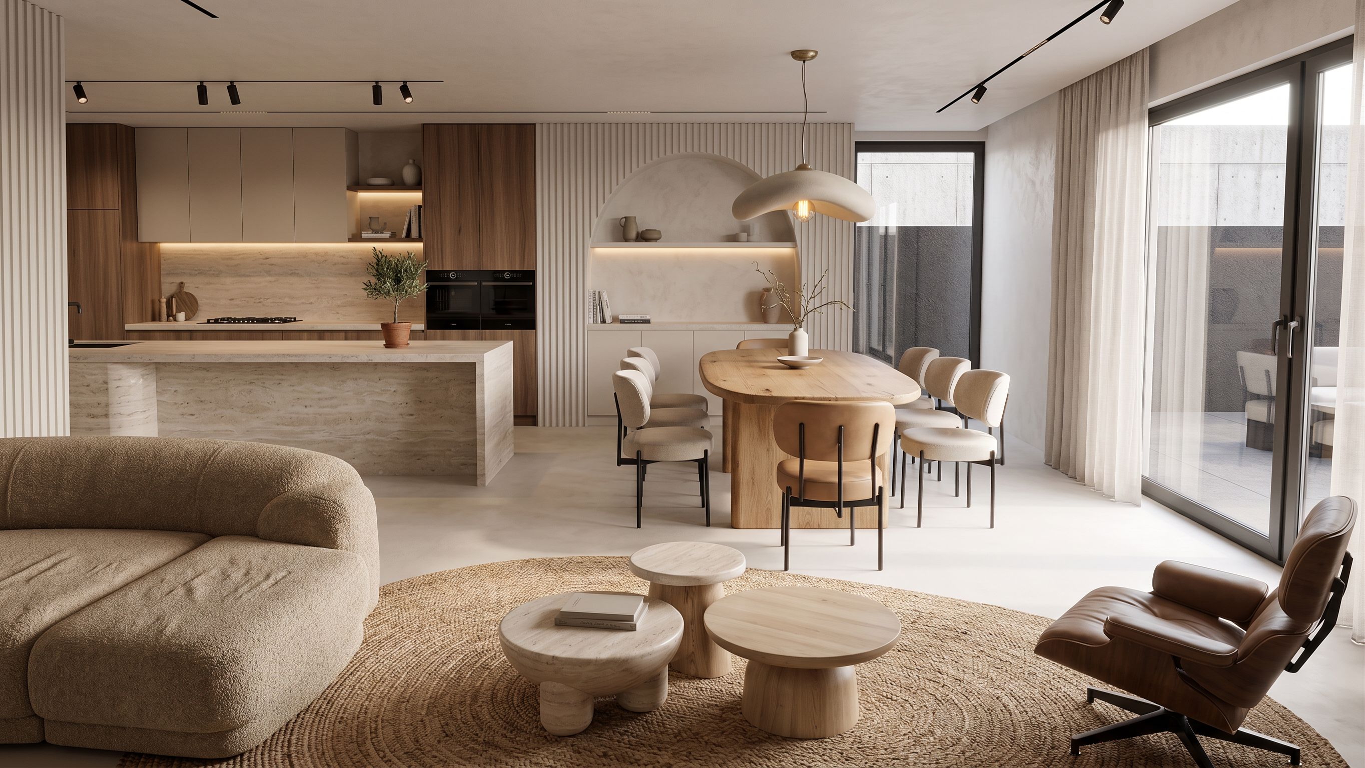 PromptUltra-realistic modern luxury open-plan interior (living room + dining area + kitchen), cohesive design language, warm neutral palette, soft minimal contemporary style with Japandi influence, high-end residential project. 🪵 GLOBAL MATERIAL PALETTE (CONSISTENCY KEY) Primary wood: natural oak / walnut veneer, matte finish, visible grain Stone: travertine / light marble, soft veining, honed finish Upholstery: bouclé fabric, linen, soft leather Metals: brushed brass / matte black accents Walls: microcement / textured plaster (off-white, beige tones) 👉 Keep all materials consistent across all spaces 🛋️ LIVING ROOM Sofas: Curved modular sofas in beige bouclé fabric Soft edges, textured surface, natural wrinkles Accent chairs: Brown leather or suede, matte, slightly worn look Coffee tables: Sculptural tables in travertine + light wood, rounded forms Rug: Large woven natural fiber rug, circular or organic shape Feature wall: 3D textured plaster / fluted panels, soft shadows 🍽️ DINING AREA Dining table: Solid oak wood table or travertine top, thick slab look Matte finish, slightly imperfect edges Chairs: Upholstered chairs in linen or leather, neutral tones Slim wood or metal legs Lighting: Statement pendant light above table Material: matte ceramic / glass / brushed metal Decor: Minimal centerpiece (ceramic vase, branches) Subtle table styling (not staged) 🍳 KITCHEN Cabinetry: Matte wood veneer (oak/walnut) + smooth beige panels Handle-less, clean lines Backsplash: Textured tiles / stone (travertine or vertical tiles) Countertop: Light marble or travertine, honed finish Island: Sculptural island with stone cladding or plaster finish Details: Built-in appliances, minimal visibility Open shelves with curated objects 💡 LIGHTING (UNIFY EVERYTHING) Natural light: Large windows Soft daylight diffused through sheer curtains Artificial lighting: Warm white (2700K–3000K) Indirect LED strips (hidden) Pendant lights as focal points Soft ambient lighting only (no harsh spots) 👉 Same lighting mood in ALL spaces 🪴 DECOR & STYLING (REALISTIC, NOT STAGED) Ceramic vases (matte, neutral tones) Books, trays, small objects Indoor plants / olive trees / light greenery Soft throws and cushions Slight asymmetry (important for realism) ✨ REALISM BOOST (DON’T SKIP THIS) Fabric wrinkles and imperfections Wood grain variation Slight surface imperfections Soft shadows and ambient occlusion Realistic reflections (not mirror-like) Light falloff and gradient shadows 🎥 CAMERA & RENDER SETTINGS Lens: 24–35mm. Eye-level or slightly low. Photorealistic rendering. Ray tracing + global illumination. Soft cinematic contrast. 8K ultra-detailed. MAIN MATERIAL: Wood Veneer Cabinet Cladding. SECONDARY MATERIALS IN THE SCENE 🪨 Island + backsplash: Travertine / limestone stone Honed (matte), soft natural texture 🪵 Floor: Engineered oak parquet (herringbone pattern) Matte oil finish 💡 Lighting: Warm LED strip under cabinets (3000K) "Same materials, same lighting, same design language, only change camera angle and space (living room / dining / kitchen)”, keep exact camera angle