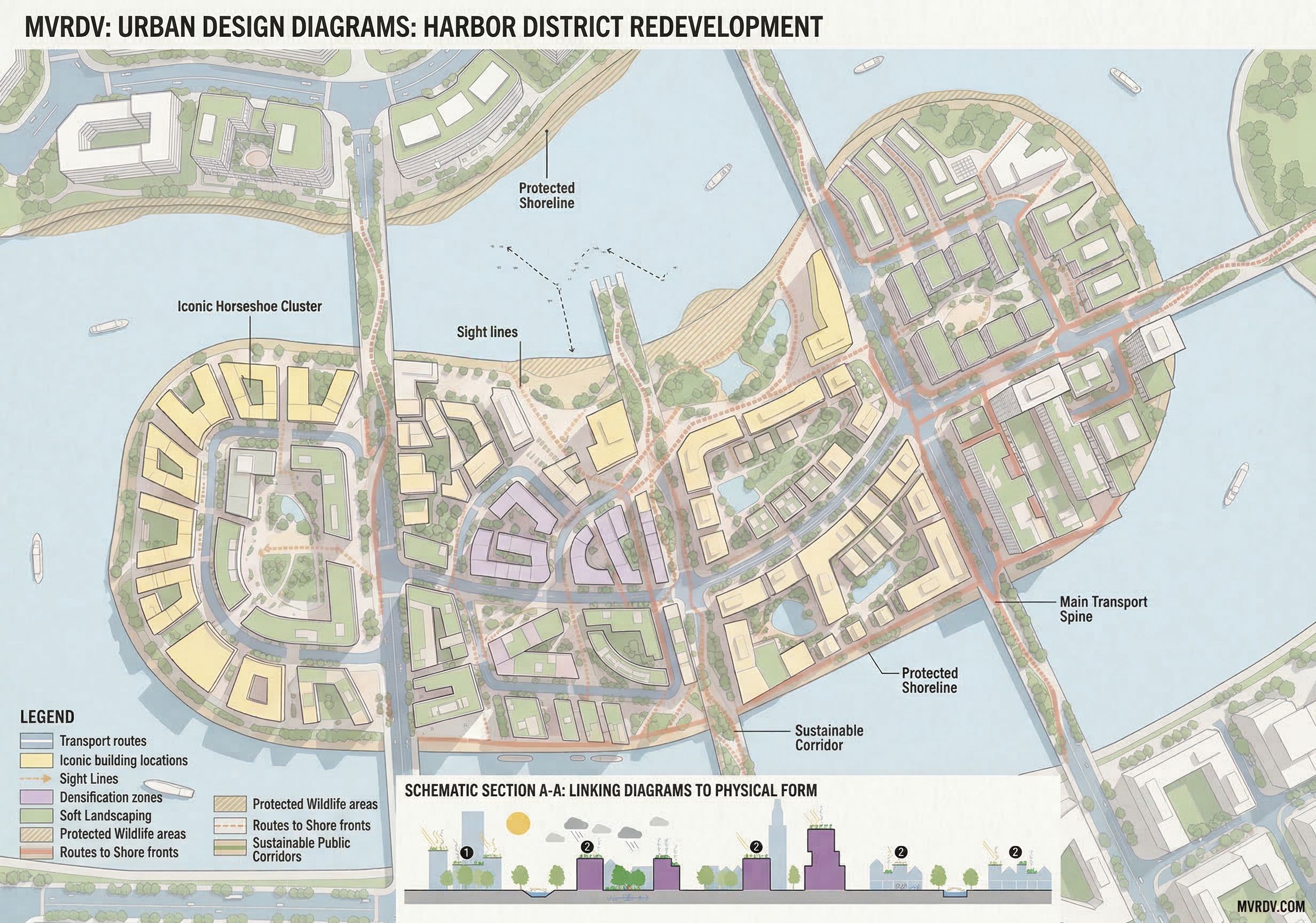 PromptProduce an Urban Design Diagrams on one page based on the uploaded image of a masterplan island, in the style of the reference images; 1. showing Transport routes, 2. Iconic building locations, 3. Sight Lines, 4. densification zones, 5. existing and proposed soft landscaping zones, 6. Protected Wildlife areas 7. Routes to Shore fronts and 8. sustainable corridors public corridors.