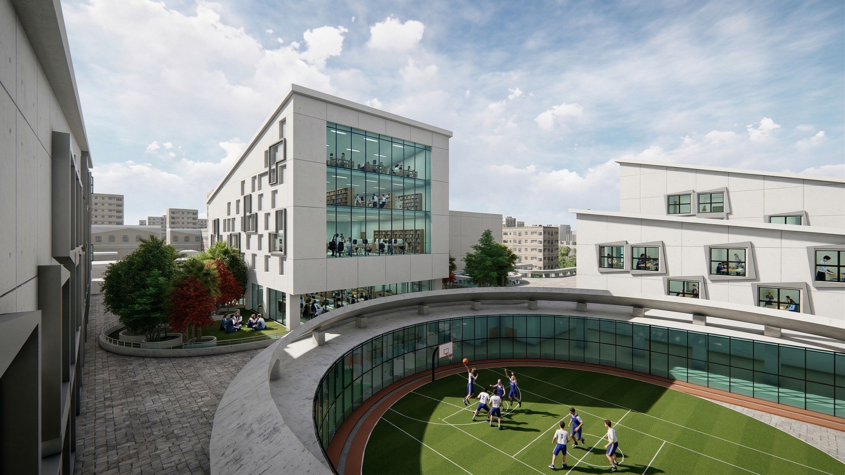 it is the exterior 0f a modern Syrian ARAB school and it shows the library and computer building and the curtain wall show the four levels don't add surroundings to the school add students in the library and under the trees only and in the classrooms and students playing in the sport court, keep exact camera angle