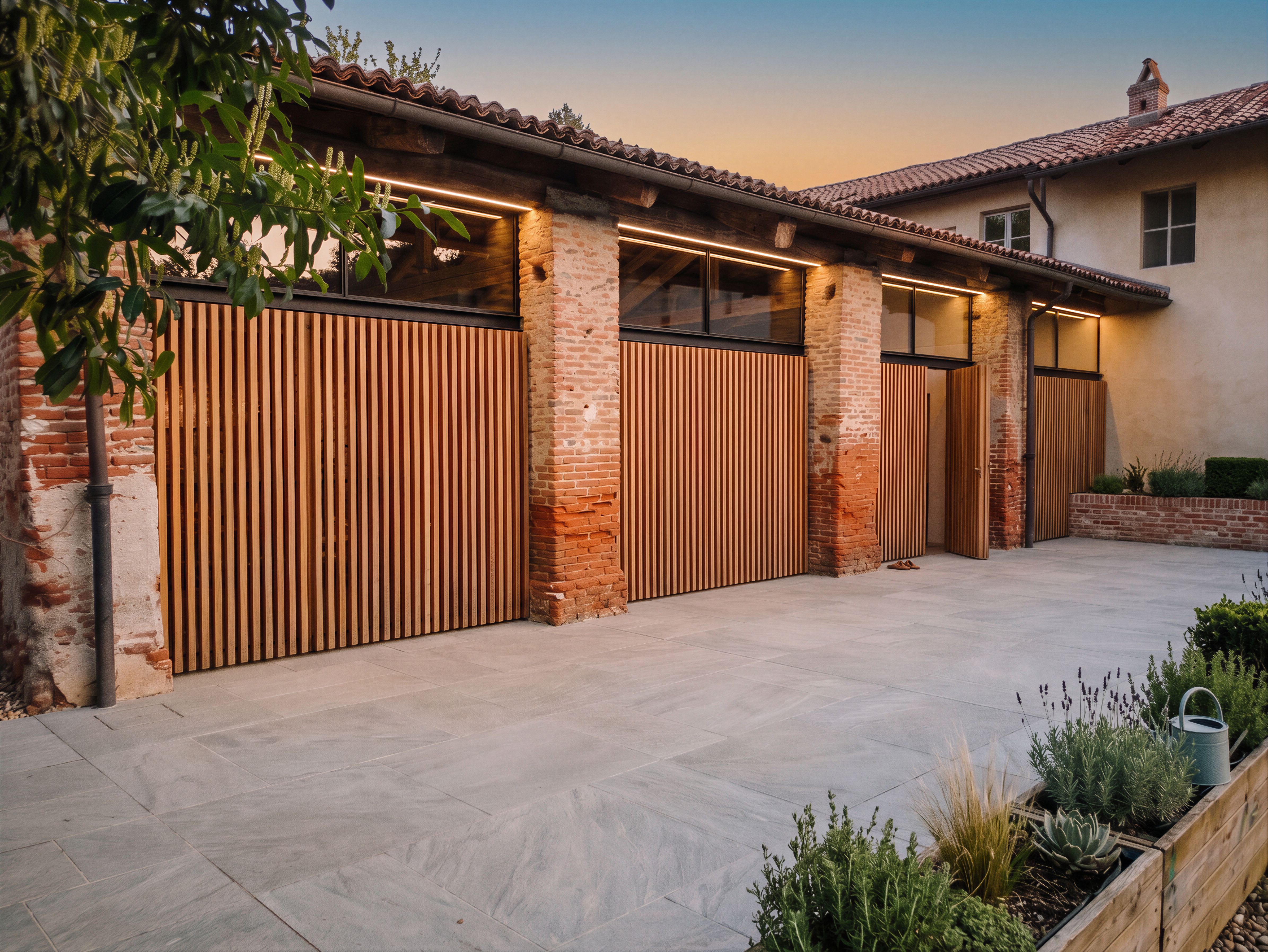 EnhancedPromptchiudi anche la parte intermedia con la stessa modalità di listellatura. La parte superiore oltre i listelli inserisci finestre con profilo in ferro a scomparsa . Nell'ultima campata verso destra prevedi un apertura verso l'esterno sempre rivestita con gli stessi listelli , keep exact camera angle