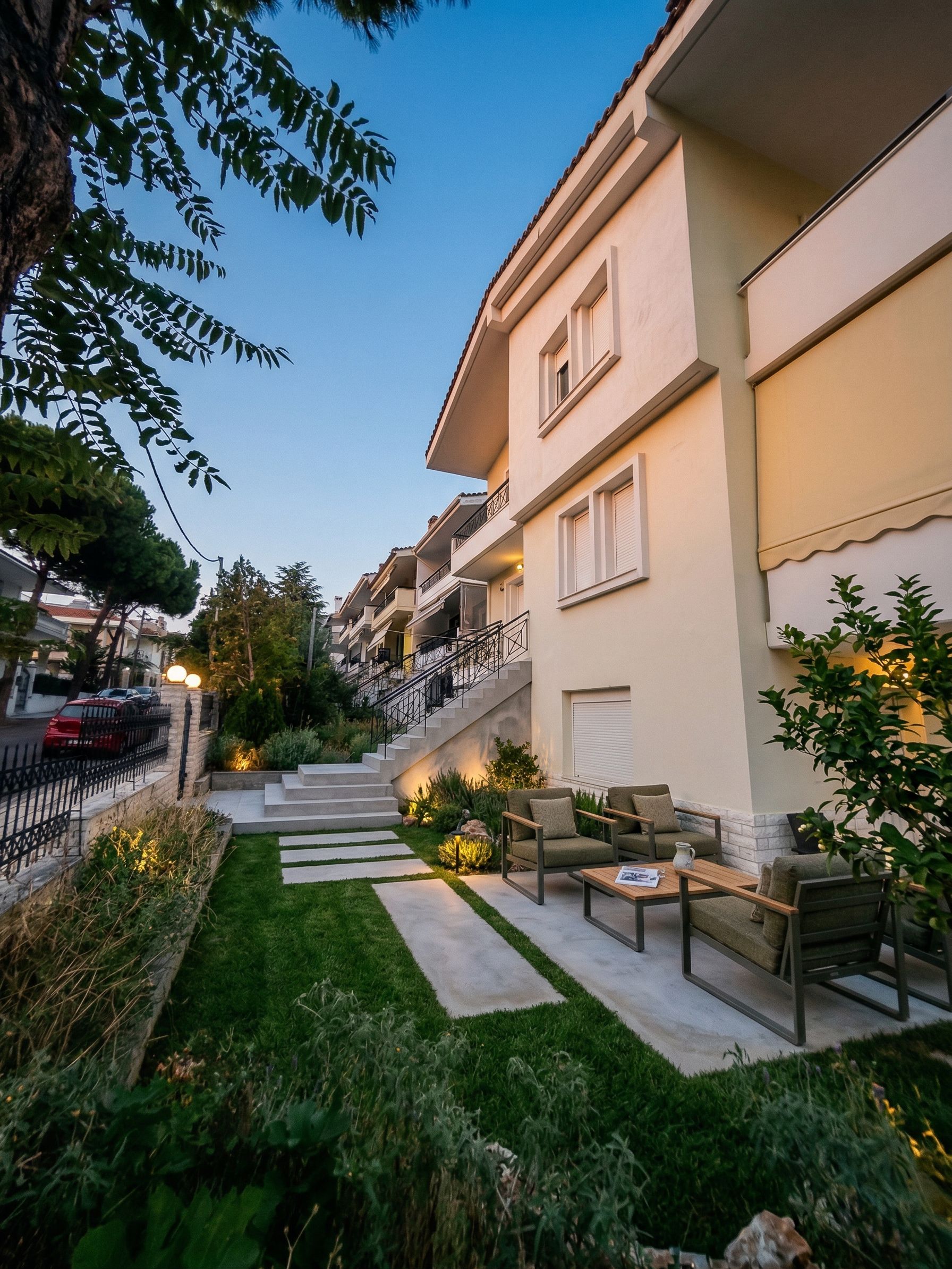 Promptcreate a beautiful exterior garden with furniture and grass. , keep exact camera angle , remove stone and put concrete, replace the marble with beautiful concrete., keep exact camera angle