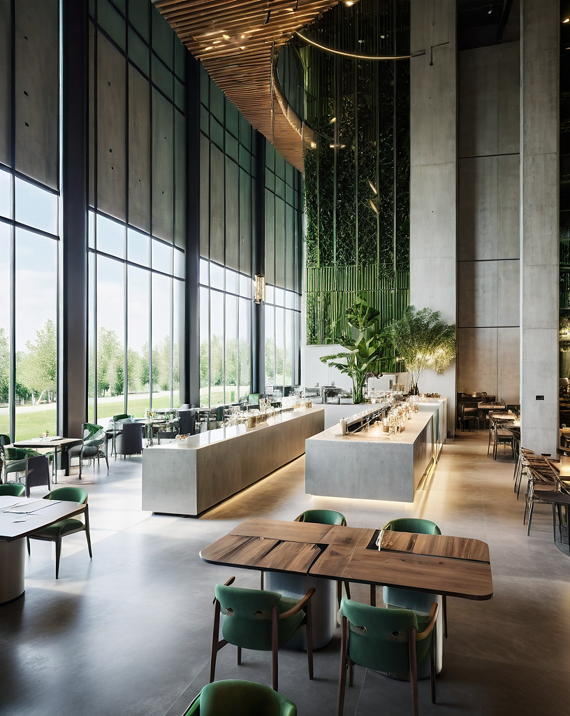 Promptmodern vip lounge, open buffet, verdant color pallette, natural daylight, concrete columns, high quality materials, glass facades, daytime sky, high quality finishing