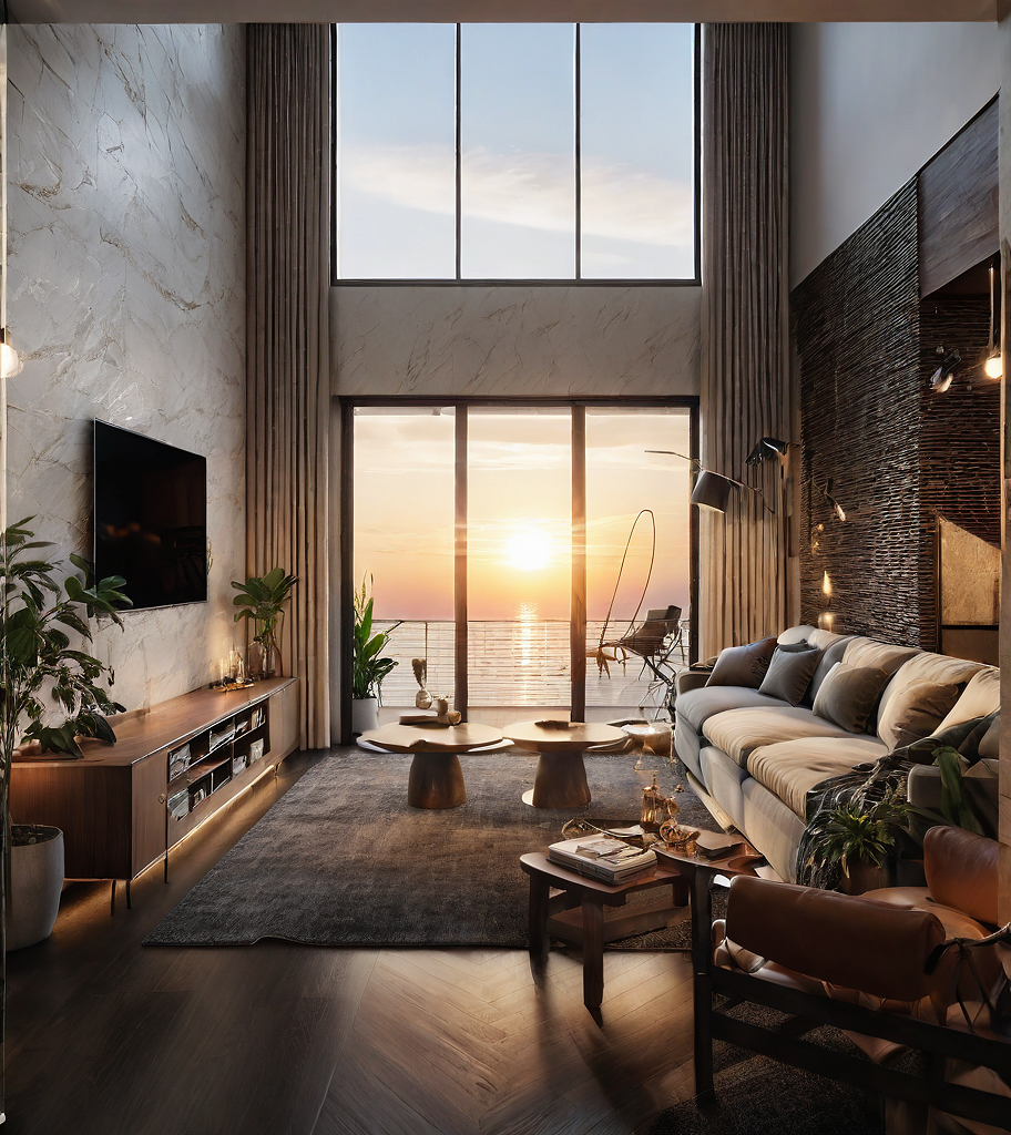 Prompta modern, realistic and beautiful living room with a sunset light in a city