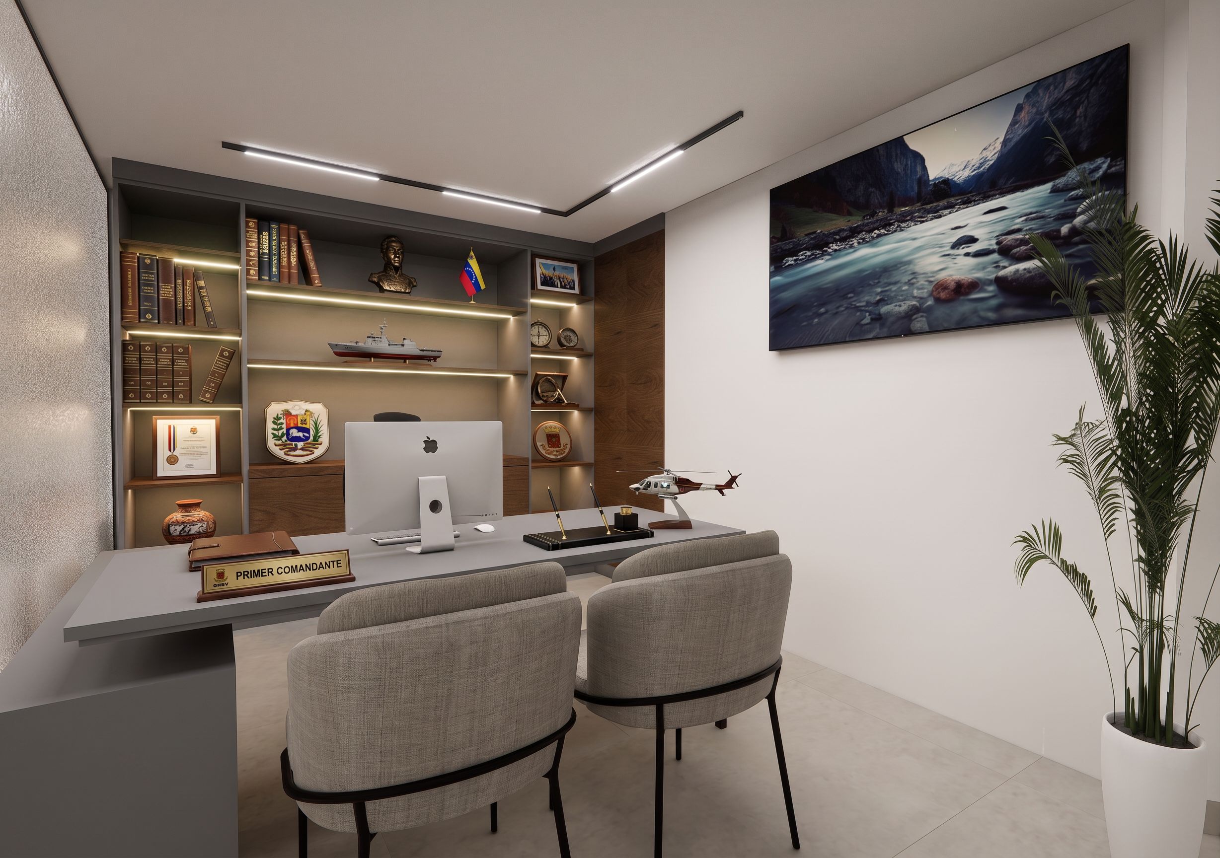 PromptAñade decoración a la estantería del fondo es la oficina del primer comandante de la guardia nacional bolivariana de Venezuela, no puedes modificar ni cambiar los materiales que salen , keep exact camera angle