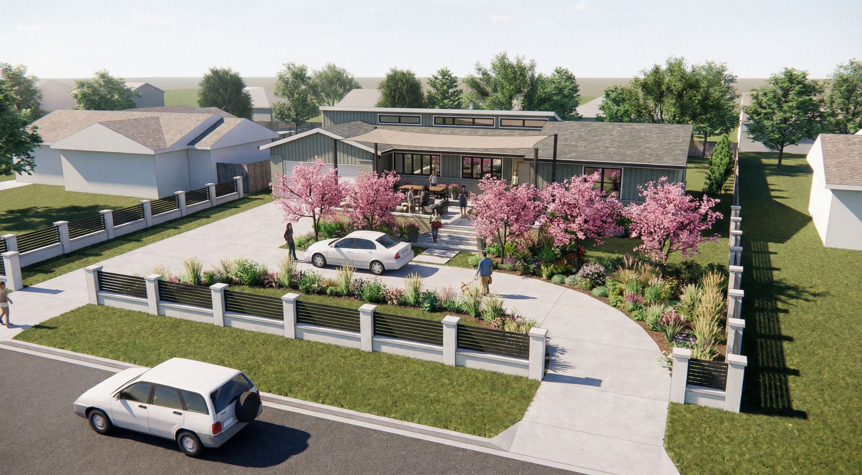 Photo of a modern single-family home nestled in a landscaped setting, showcasing a combination of horizontal gray green lap siding glass materials for a clean façade. The design features a spacious porch framed by vibrant cherry blossom trees and a neat garden, emphasizing outdoor living. Nearby houses create a suburban vibe. Bright daylight casts soft shadows, enhancing textures. Captured from a high angle with a 24mm lens to highlight the layout and surrounding greenery, inviting a sense of community and tranquility in the neighborhood., keep exact camera angle